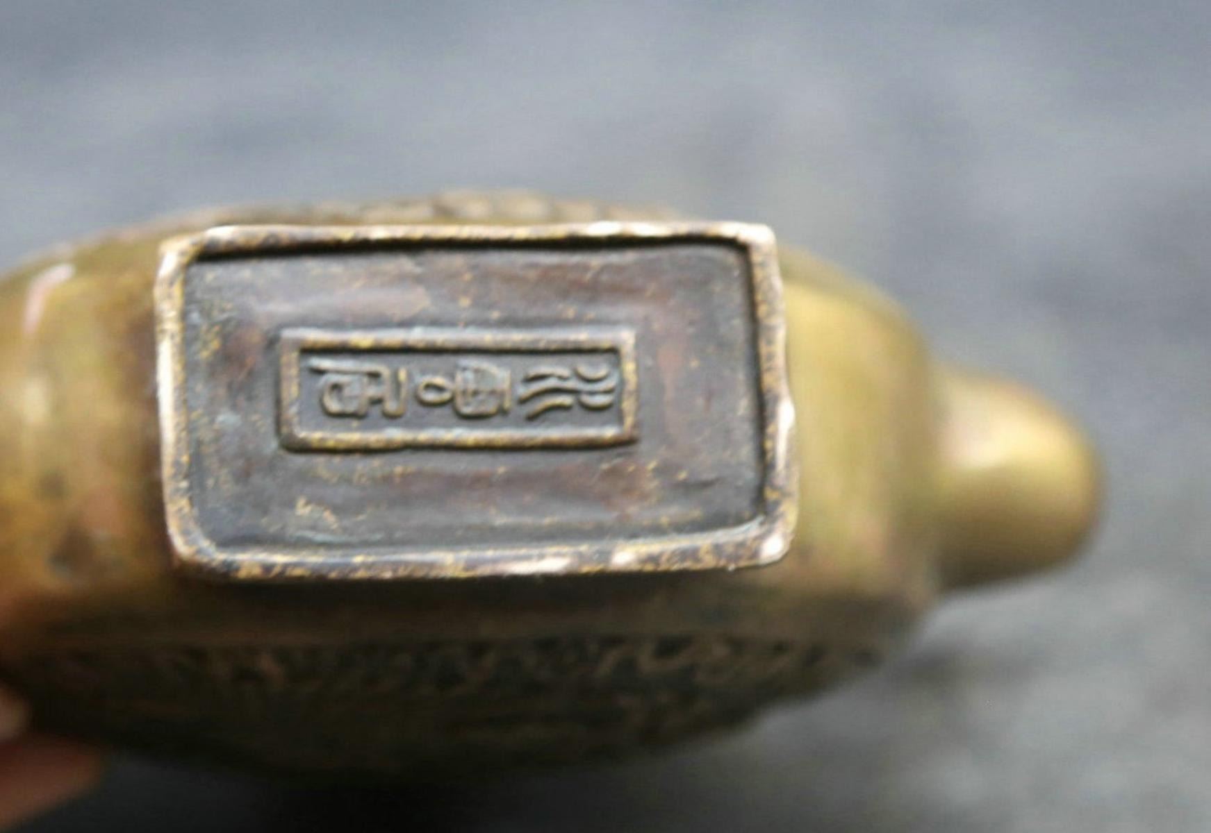 Antique Chinese Brass Auspicious Dragon & Phoenix Pot......Material: Brass;Size: Long: 7.9". Width : 7.1". Height : 2.2"Weight: 828 Grams; Origin - China