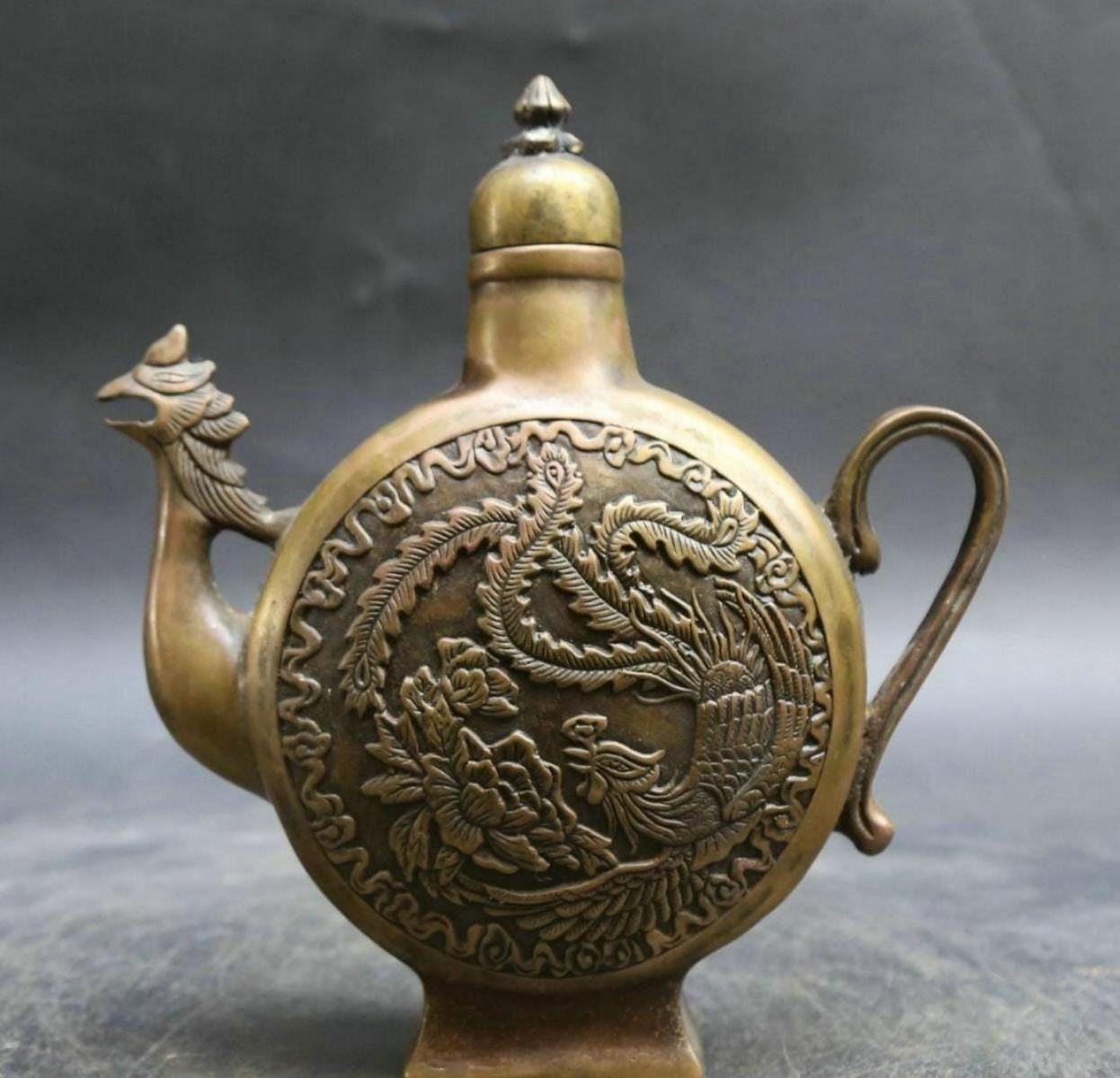 Antique Chinese Brass Auspicious Dragon & Phoenix Pot......Material: Brass;Size: Long: 7.9". Width : 7.1". Height : 2.2"Weight: 828 Grams; Origin - China
