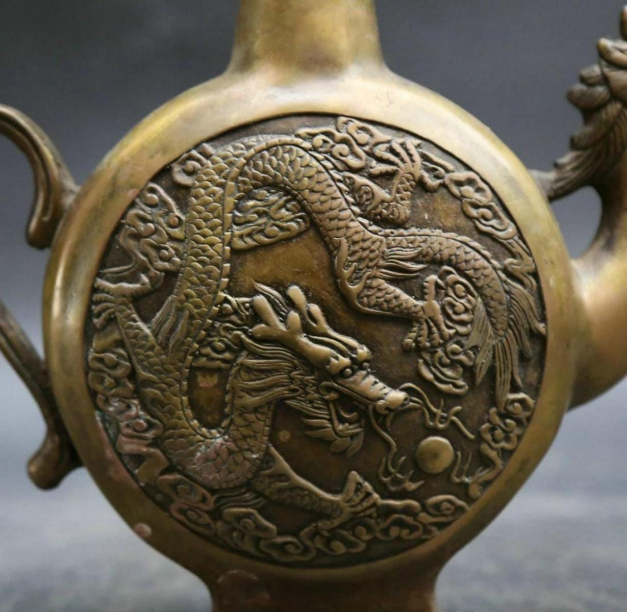 Antique Chinese Brass Auspicious Dragon & Phoenix Pot......Material: Brass;Size: Long: 7.9". Width : 7.1". Height : 2.2"Weight: 828 Grams; Origin - China