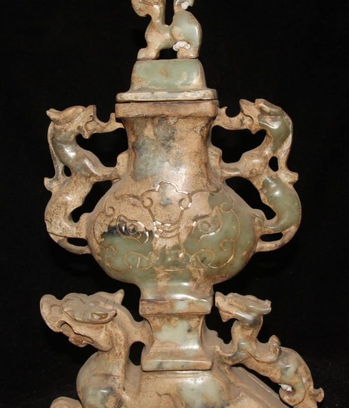 Antique Chinese Jade Carving Dragon Beast PiXiu Pot Jar.....Size: Height 11.4 inch ; This antique has been kept in very good condition. Its beauty for jade collectors.