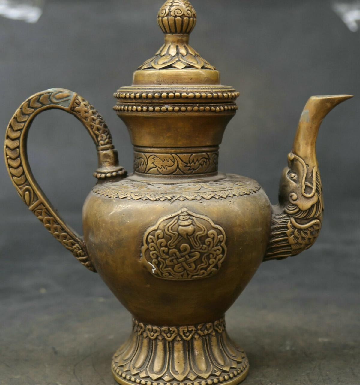 Antique Chinese/Tibetian Bronze Wine/Tea Kettle .....Material: Bronze; Size: Length: 7.9"; Width : 6.7". Height : 2.4".....