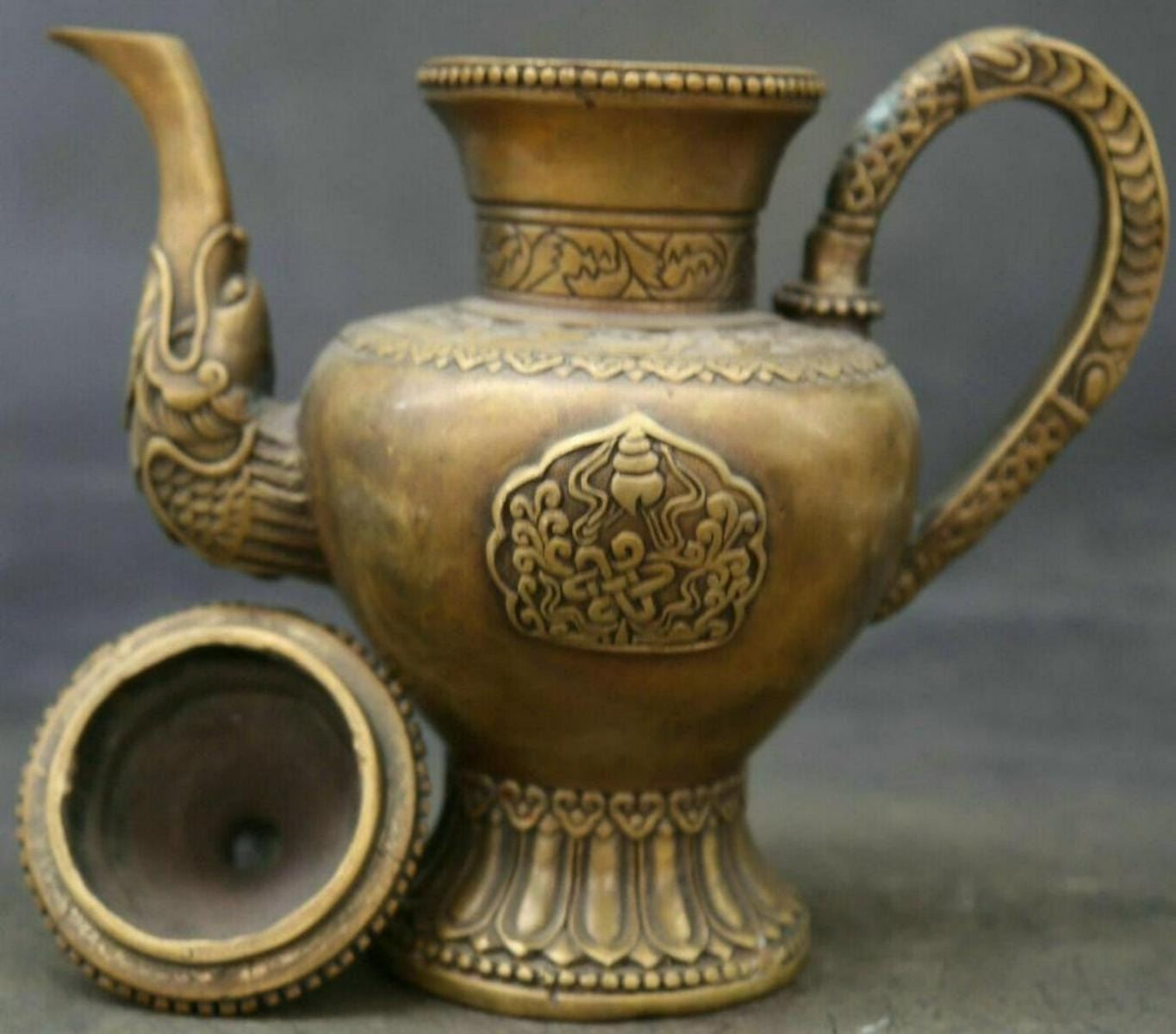 Antique Chinese/Tibetian Bronze Wine/Tea Kettle .....Material: Bronze; Size: Length: 7.9"; Width : 6.7". Height : 2.4".....