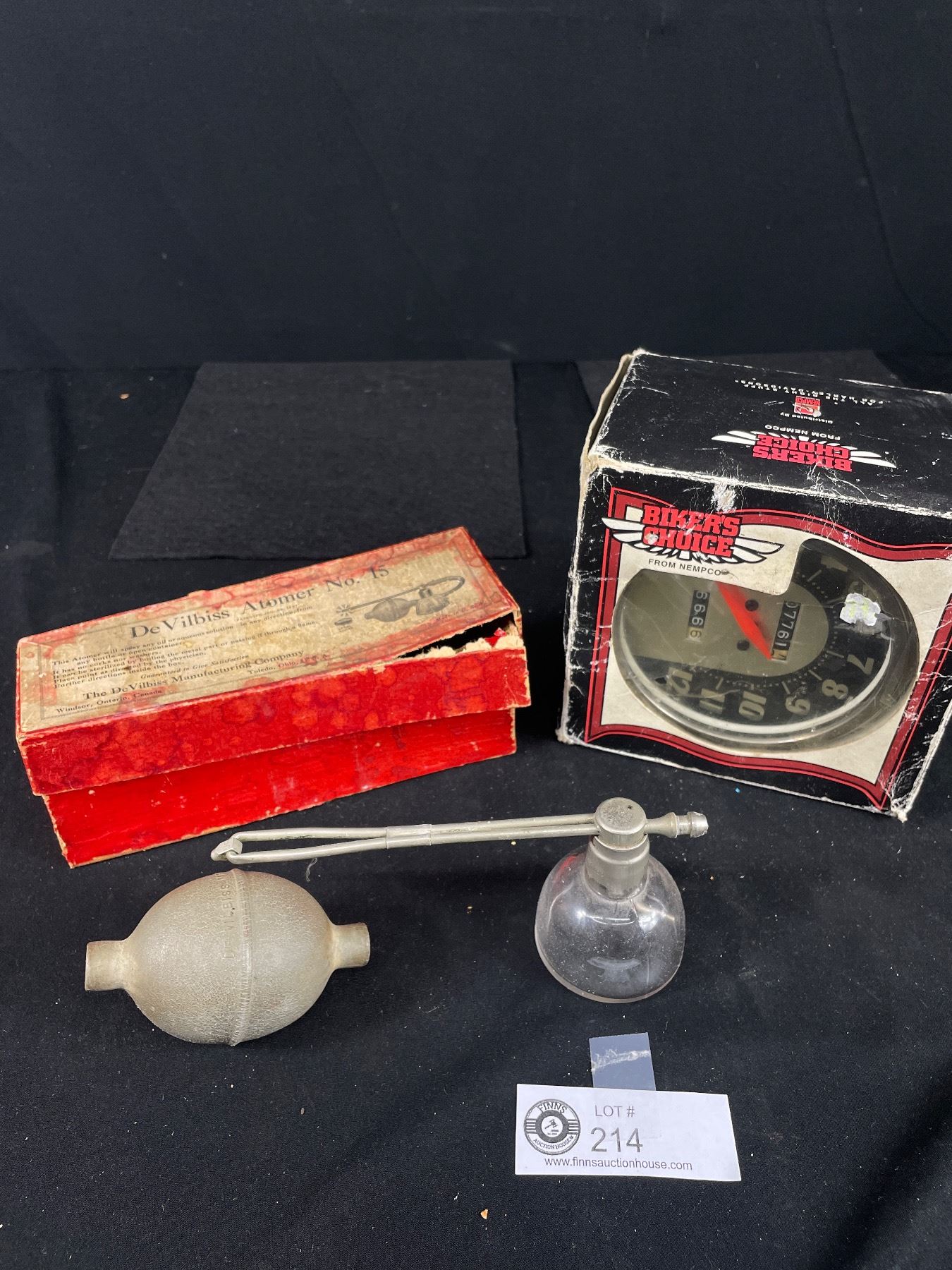 Antique De Vilbiss Atomizer, Very Unique and Nempco Bikers Choice Harley Davidson Motorcyle Speedometer