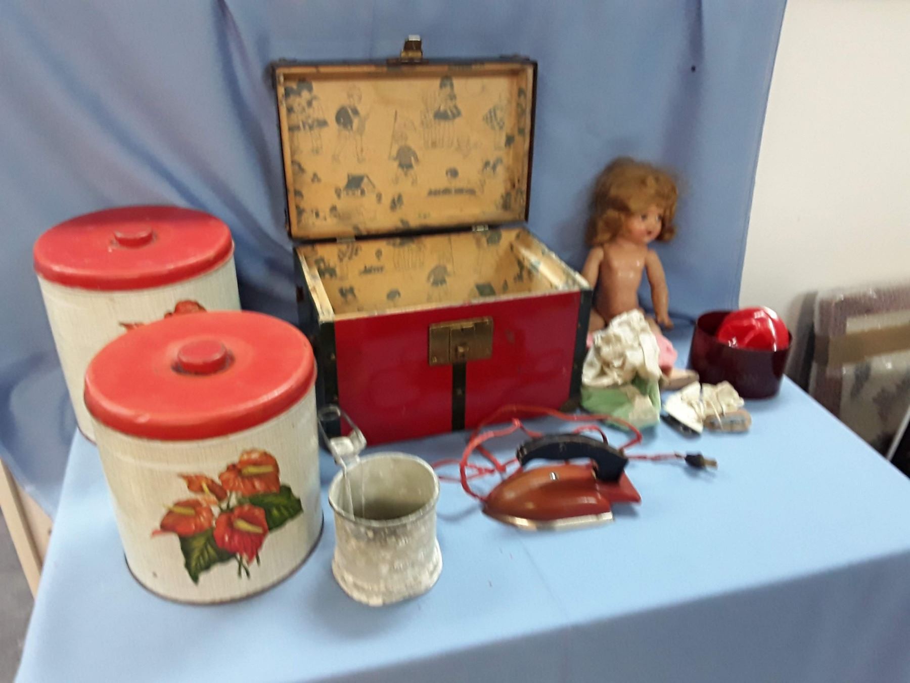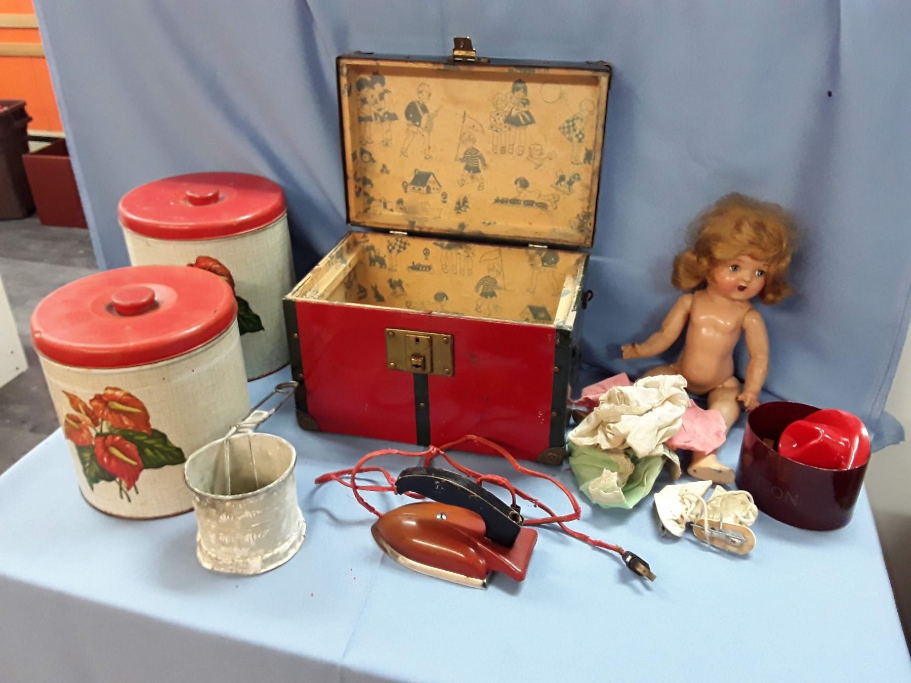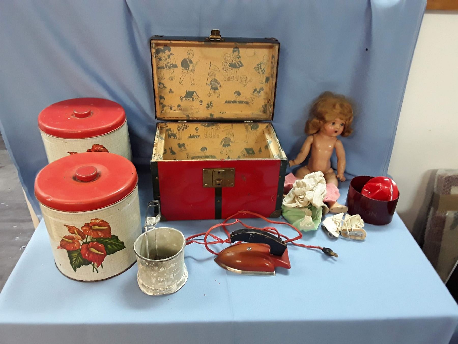 Antique Doll W/Clothes, Mini Vintage Iron, Cannisters + More, - 17% Buyer Fee. Payment Processed through Live Auction World ( Visa or Master Card ) pick up Saturday, or Tuesday
