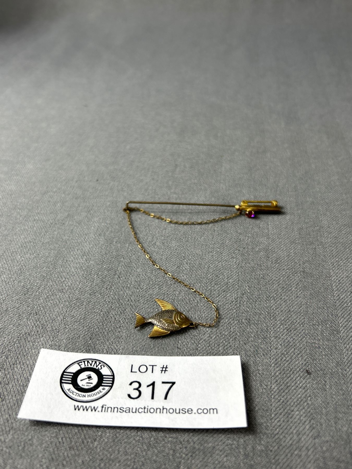 Antique Fishing Rod w/ Dangle Fish Brooch, 3"L. Original Patina