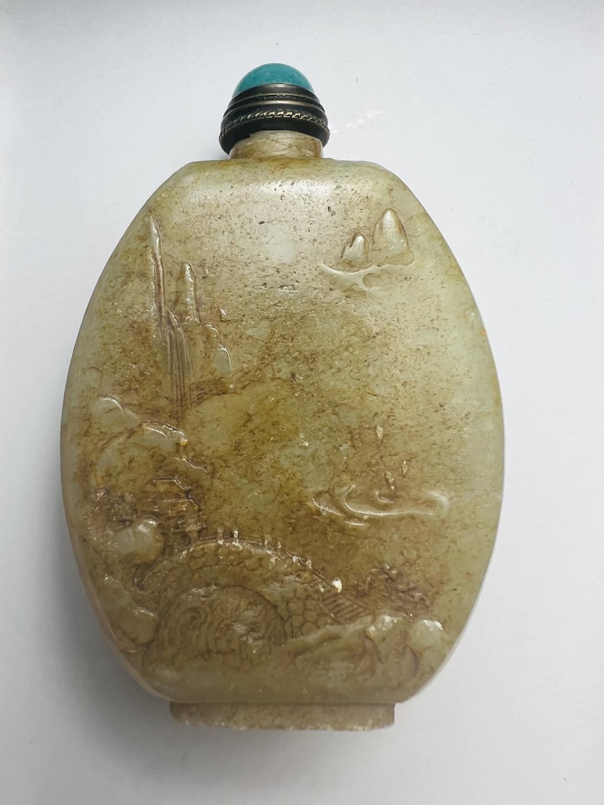 Antique hand carved Chinese Jade flower with Guaniyan figurine on snuff bottle;Size:Height-71.86mm;Width-45.9mm;Origin-China.