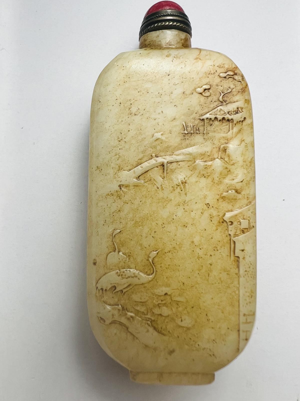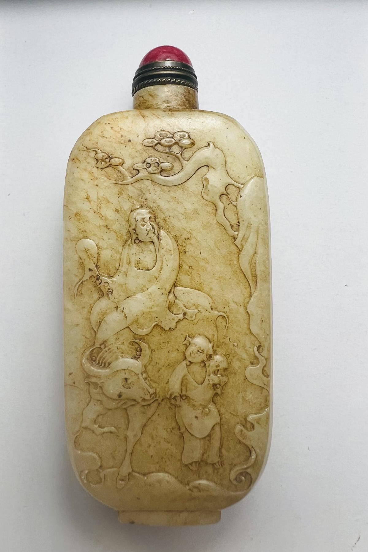 Antique hand carved natural Chinese Jade flower with statues figurine on snuff bottle;Size:Height-87.02mm;Width-36.81mm;Origin-China.