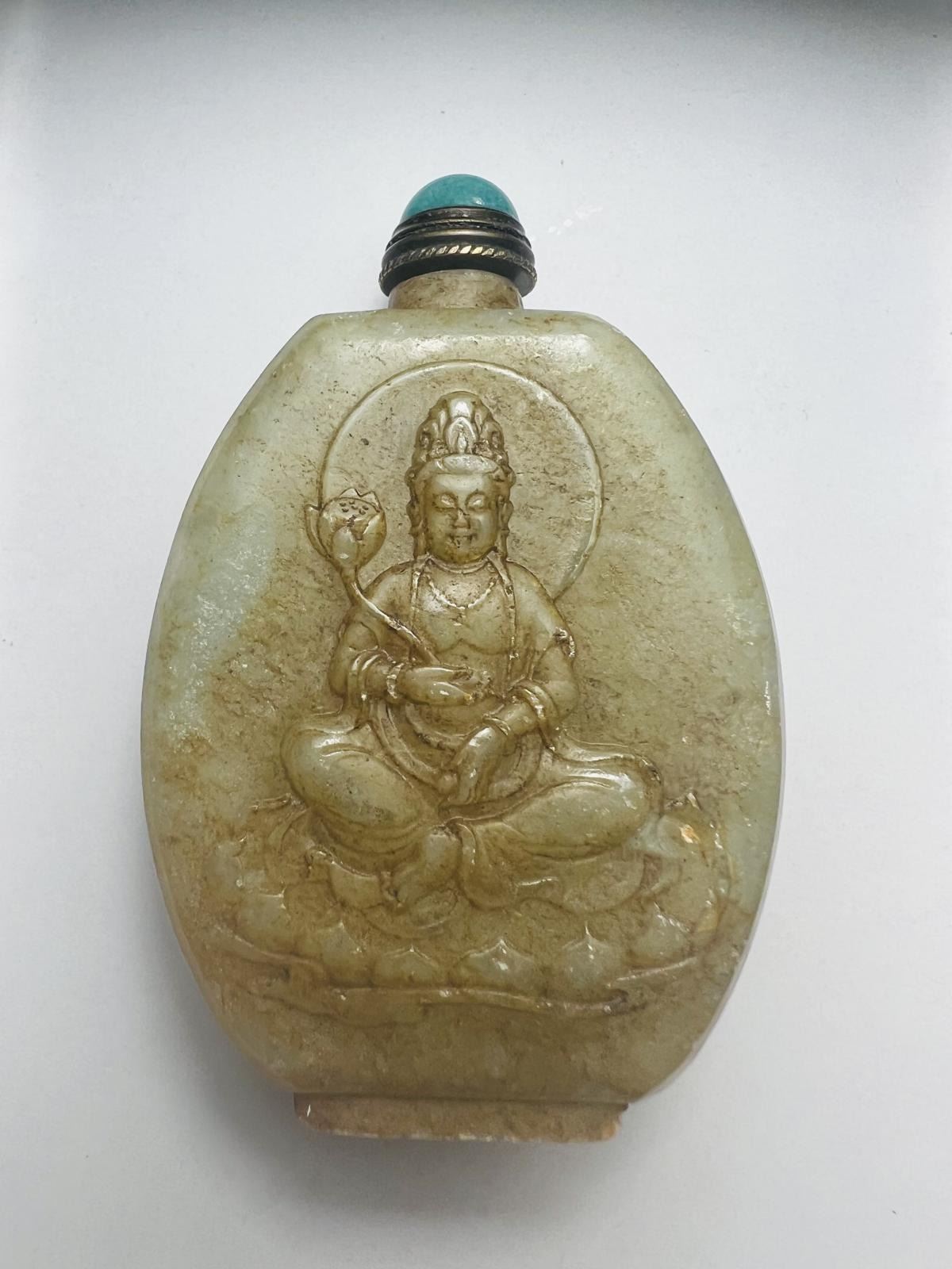 Antique hand carved Chinese Jade flower with Guaniyan figurine on snuff bottle;Size:Height-71.86mm;Width-45.9mm;Origin-China.