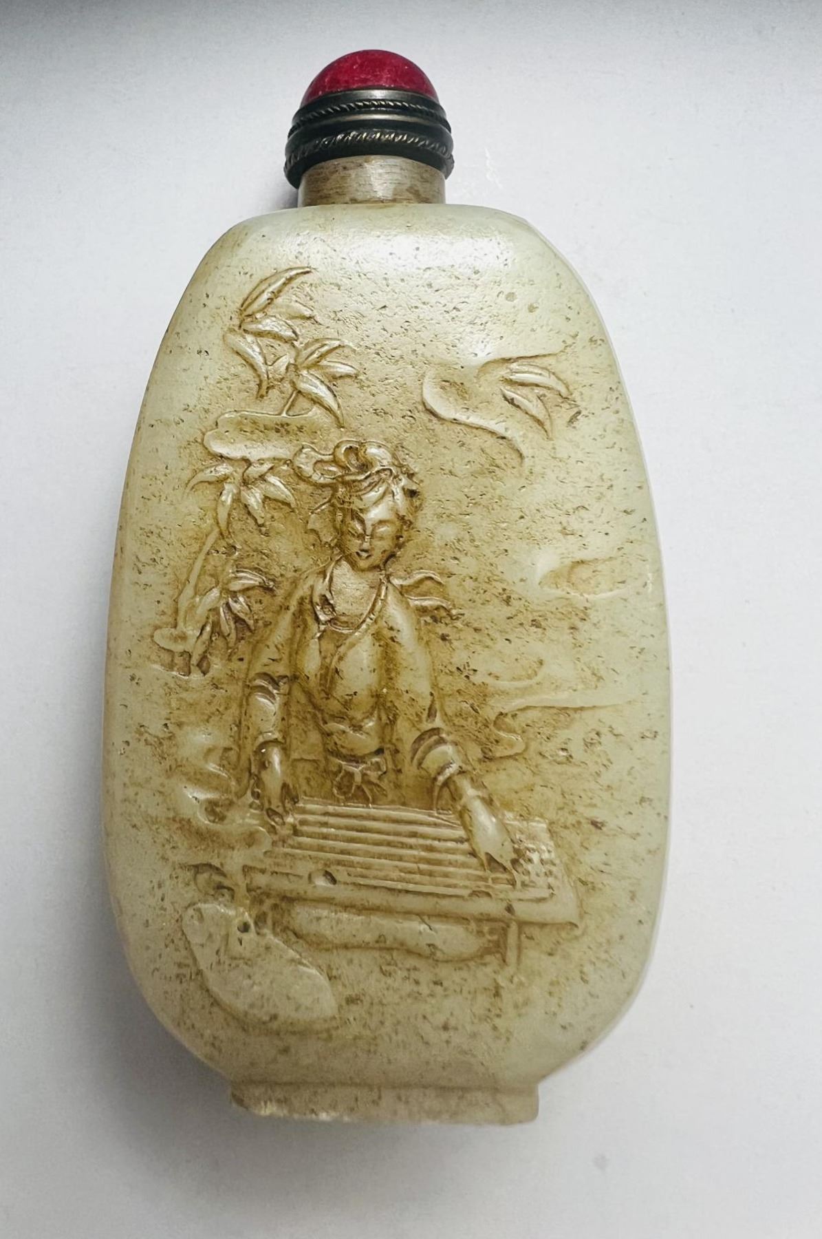 Antique hand carved Chinese jade flower with classic Chinese beauty figurine snuff bottle;Size:Height-73.7 mm;Width-37.5mm;Origin:China.