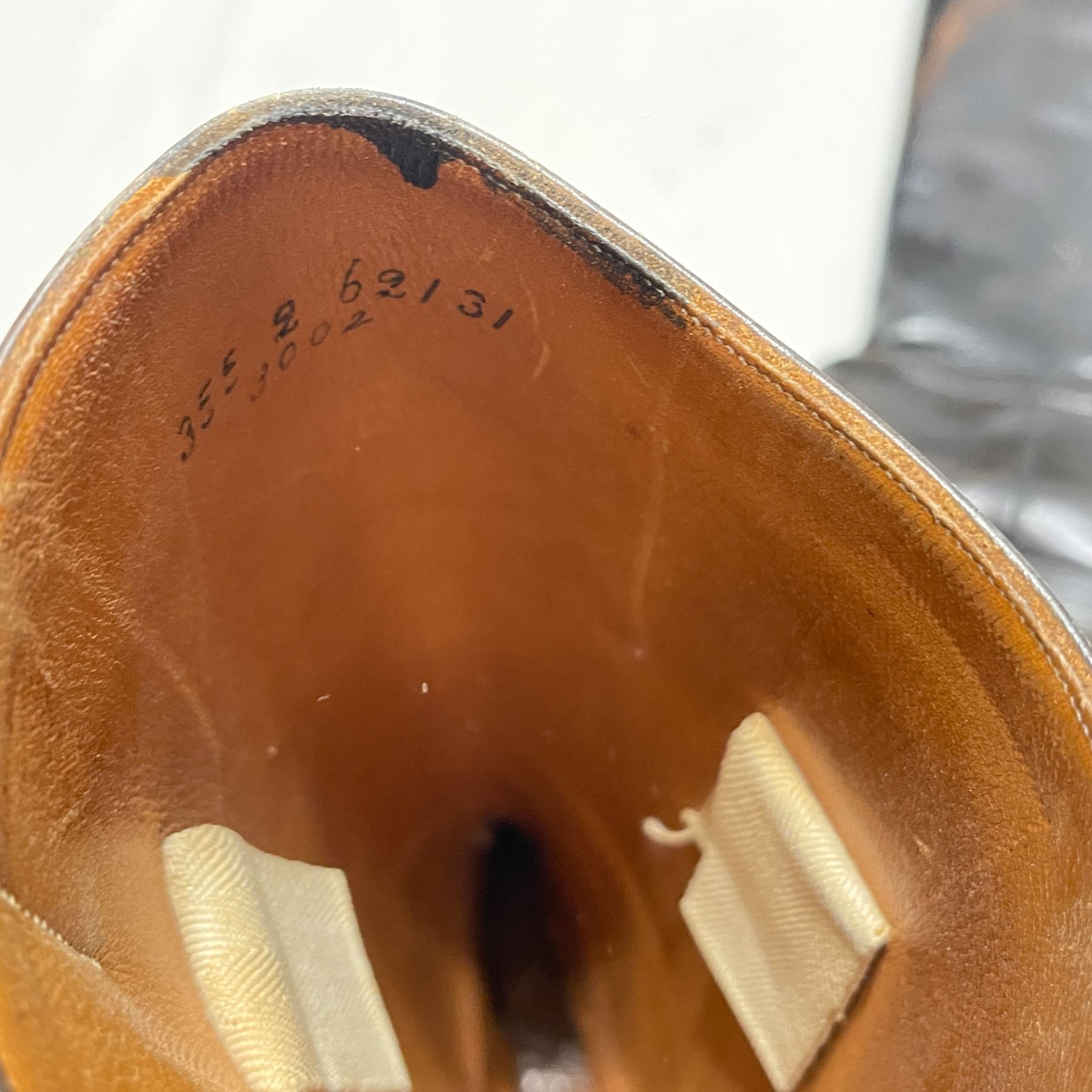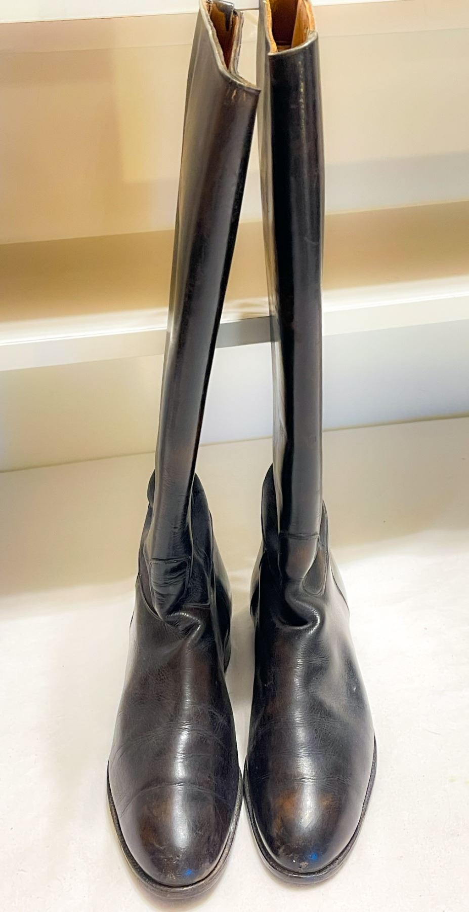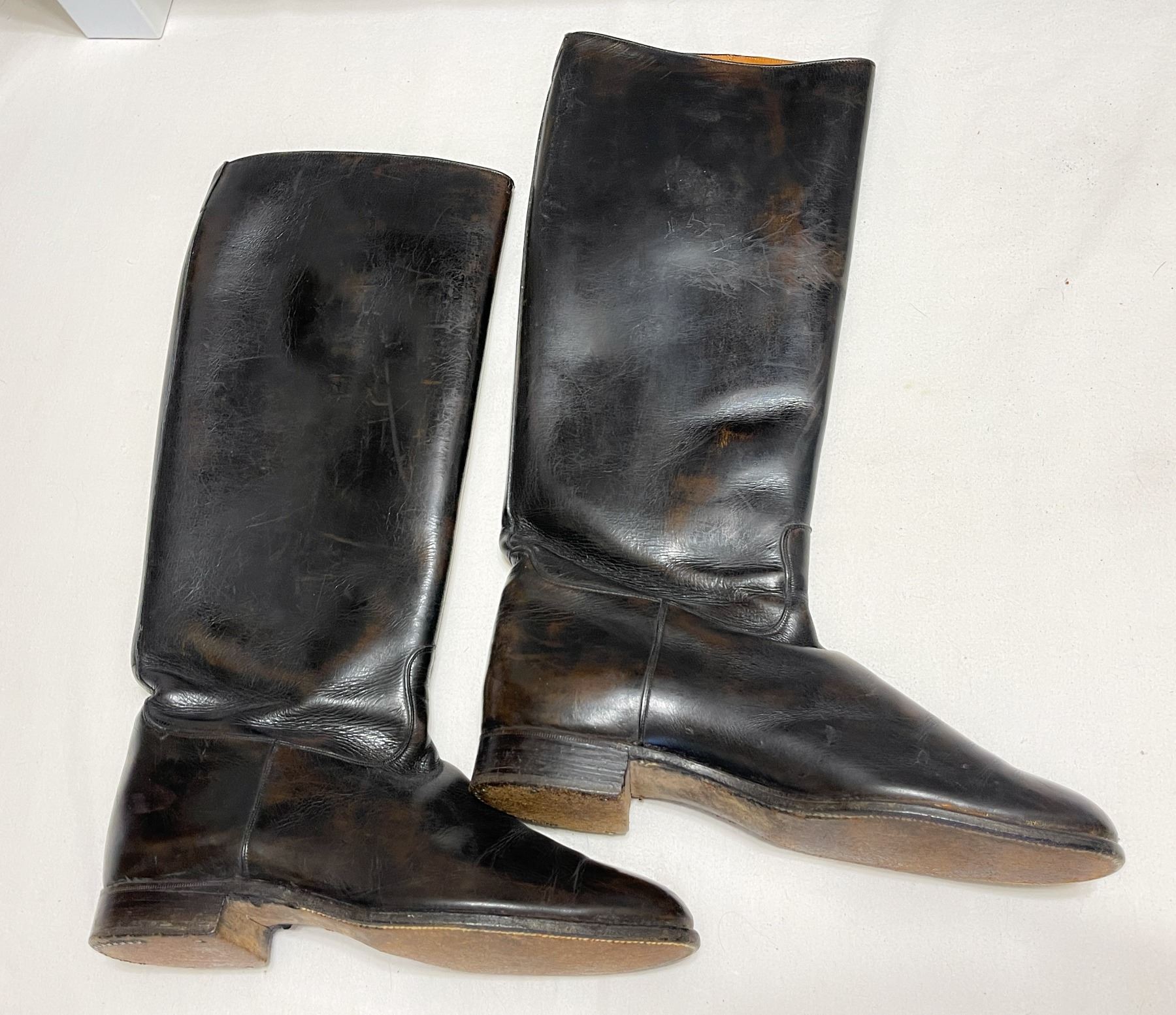Handsome pair of antique black leather riding boots with stitched soles and nailed heels, showing beautiful patina and craftsmanship. Fully lined in smooth tan leather and marked with original maker’s codes inside the shaft. Smaller in size, likely for a youth or adolescent rider.