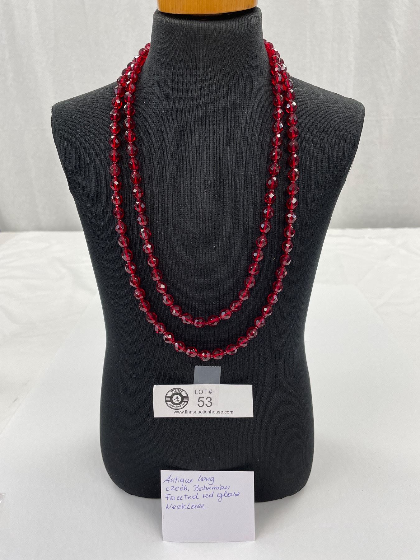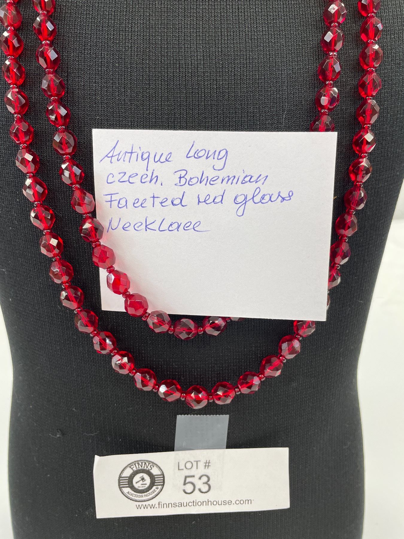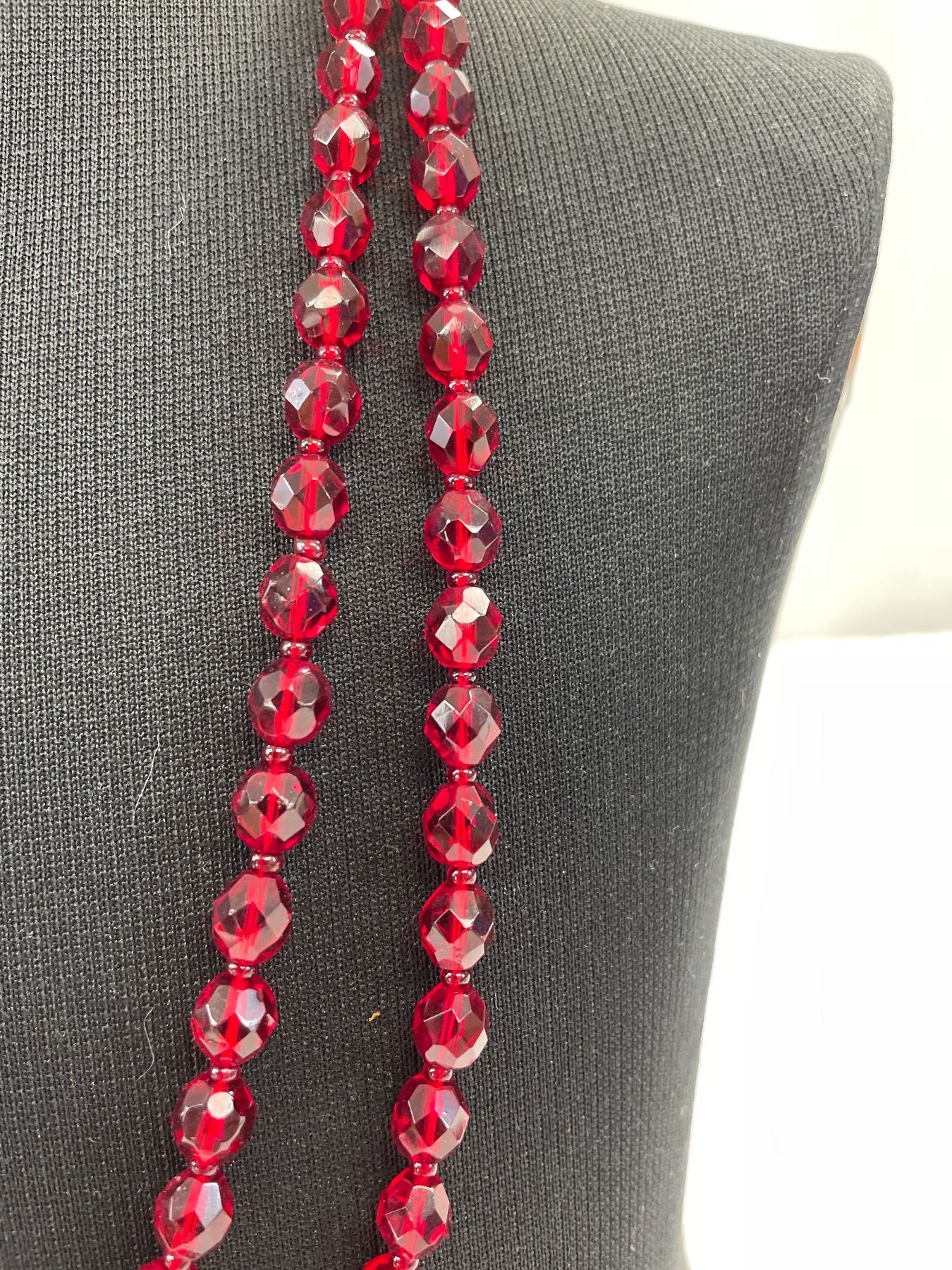 Antique Long Czech Bohemian Faceted Red Glass Necklace