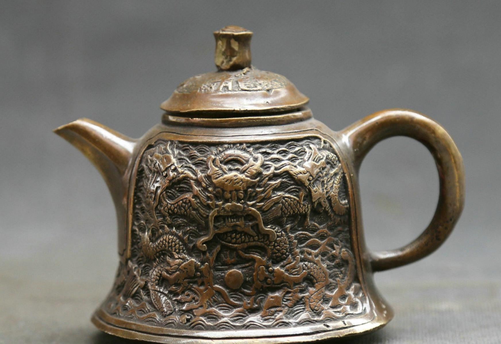 Antique Marked Chinese Bronze Dynasty Dragons Kettle; Description Size: Length : 11.0 cm / Width: 9.5cm / Thickness : 8.5 cm/ 1 inch= 2.54 cm material: Bronze weight :344 g