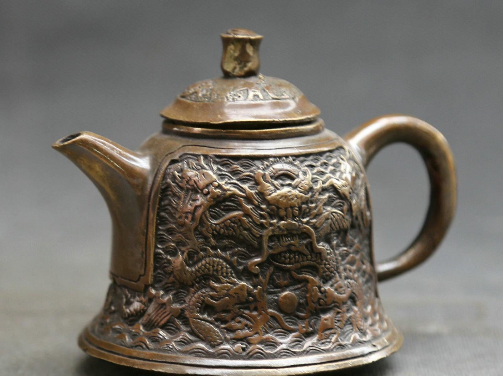 Antique Marked Chinese Bronze Dynasty Dragons Kettle; Description Size: Length : 11.0 cm / Width: 9.5cm / Thickness : 8.5 cm/ 1 inch= 2.54 cm material: Bronze weight :344 g