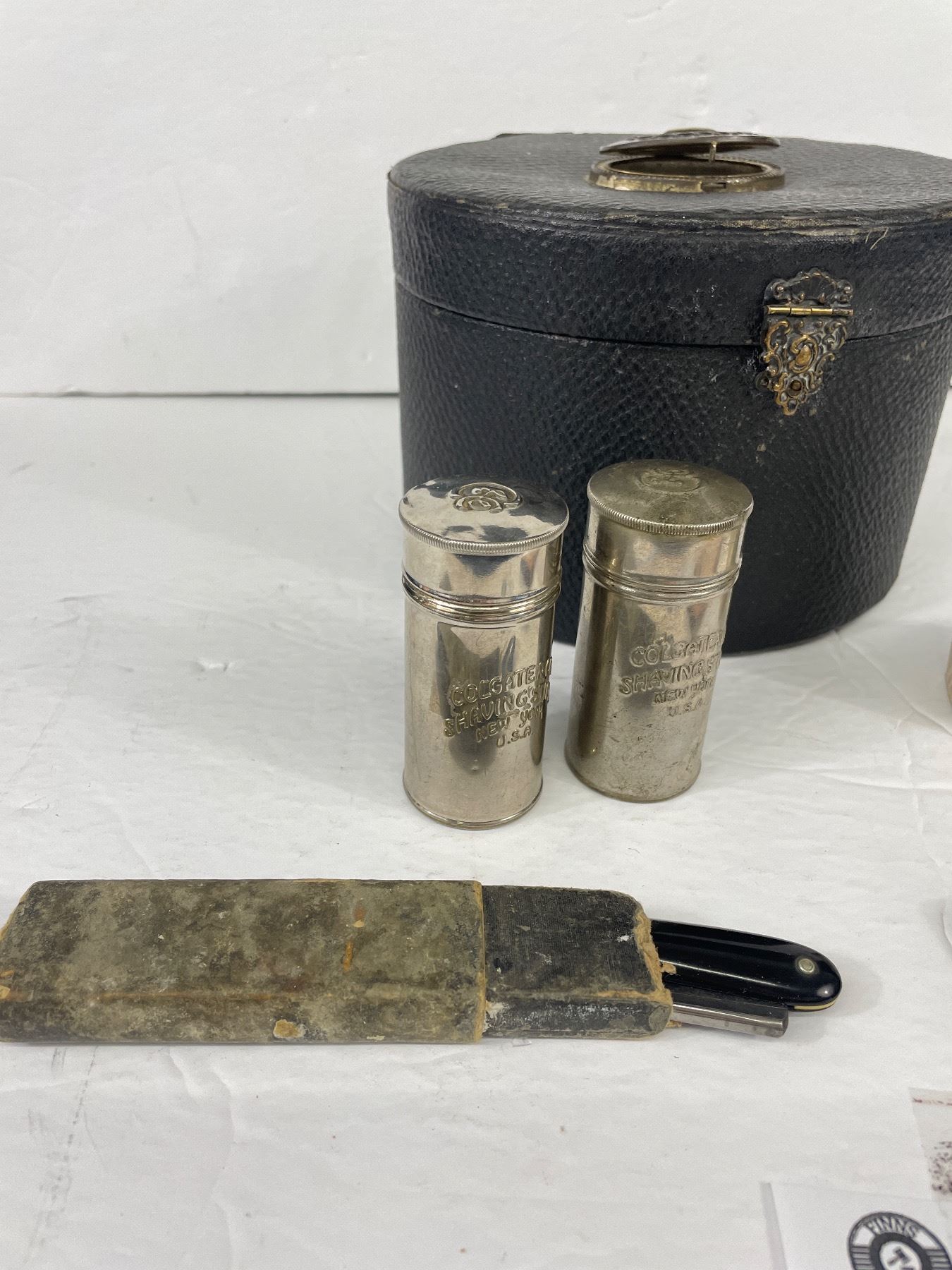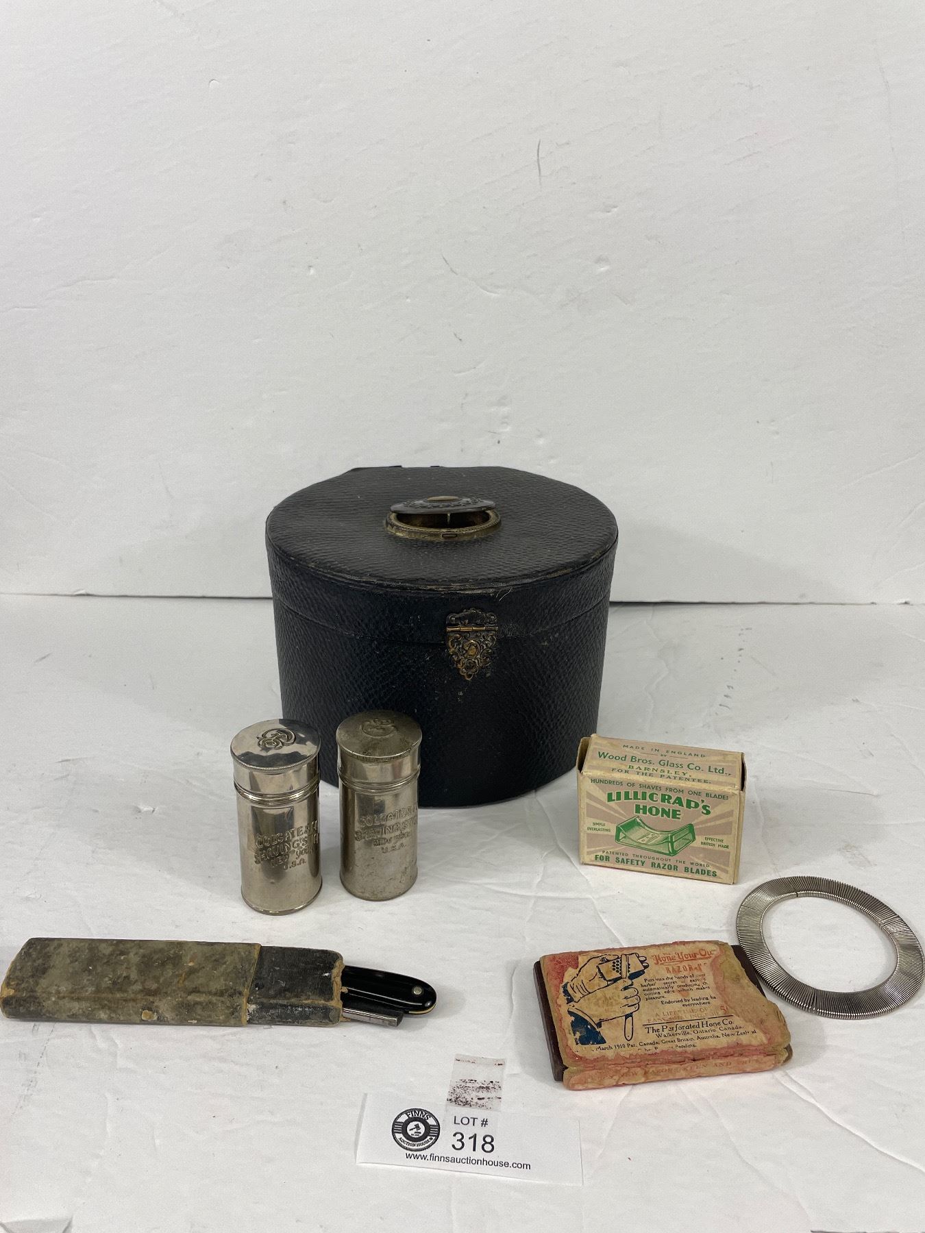 Antique Men's Shaving Kit ( Razor, 2 Hones, 2 Metal Containers In Box)