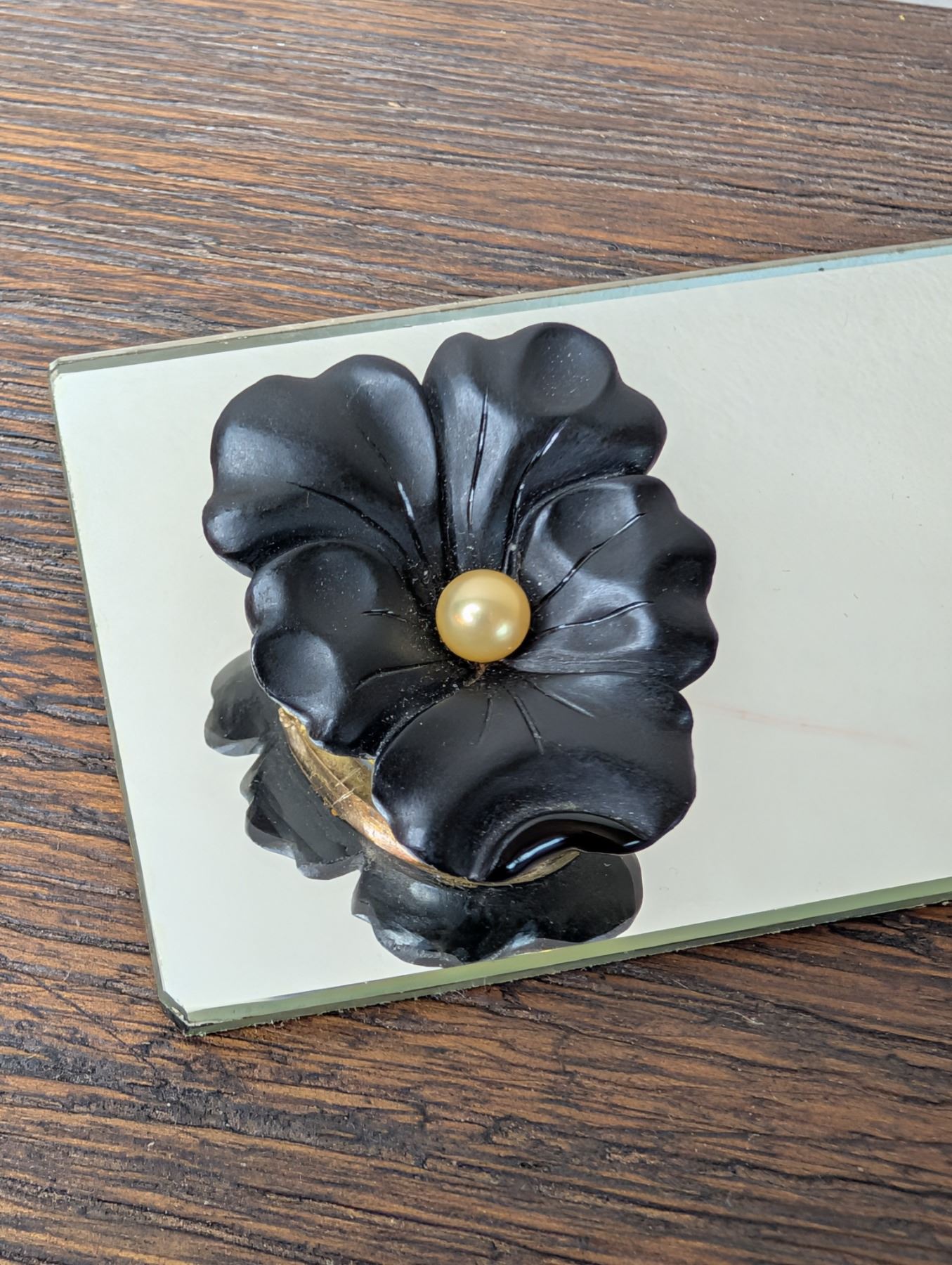Beautiful antique Mourning Pin (possibly Victorian) matte black flower with pearl accent and gentleman's portrait on the back