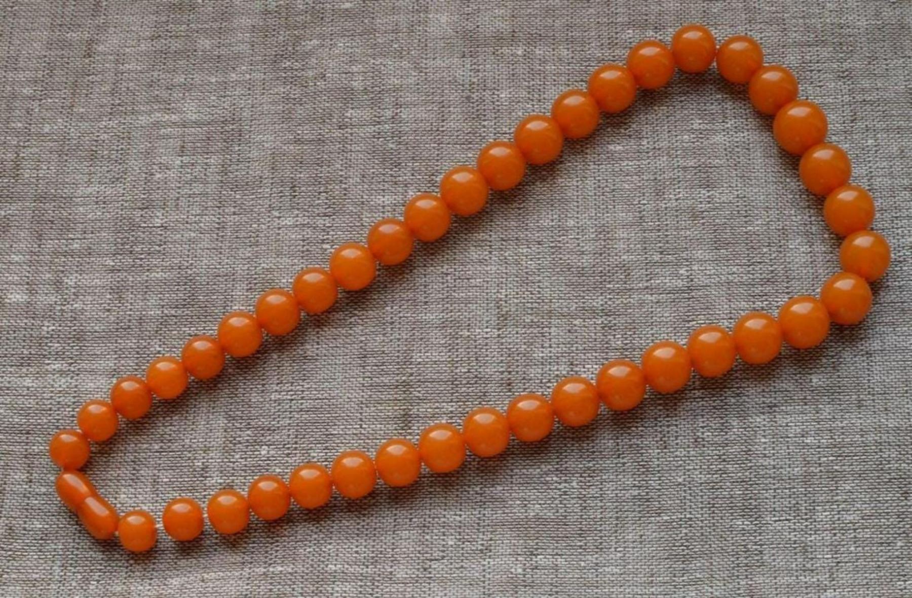 Antique Natural Amber Necklace.........Weight: 55,7 grams; Color: Egg Yolk Lenght: 10 inch= 25 cm (Total lenght: 20 inch).Bottam/ Middle bead 17 MM ..then 10 MM then ..Gradually smaller beads going towards back..Origin - Lithunia