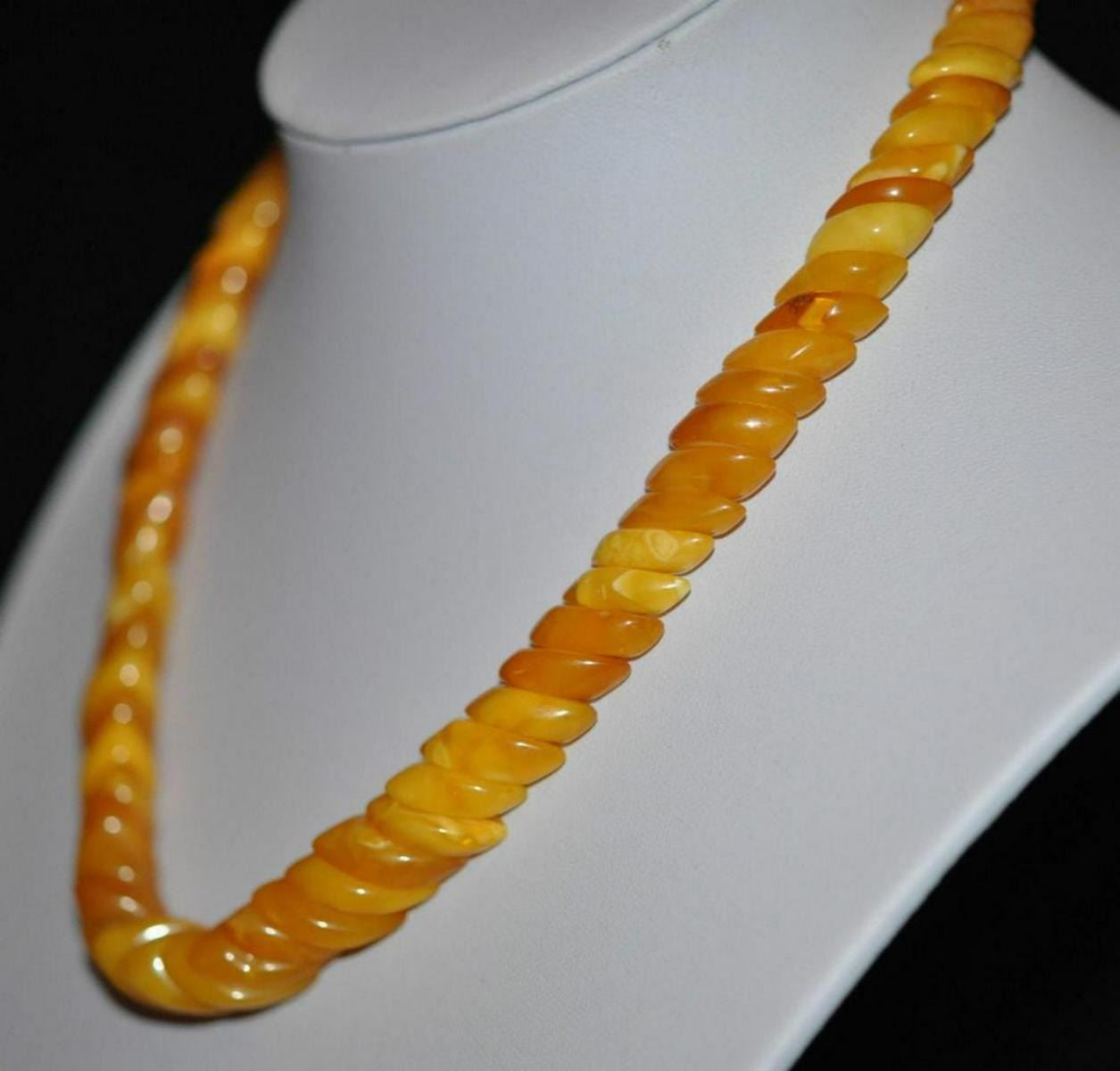 Antique Natural Butterscotch Egg Yolk Amber Necklace; Measurements: the length is 48 centimeters the biggest amber measures 21 x 10 x 5 mm; Weight is 36.7 grams