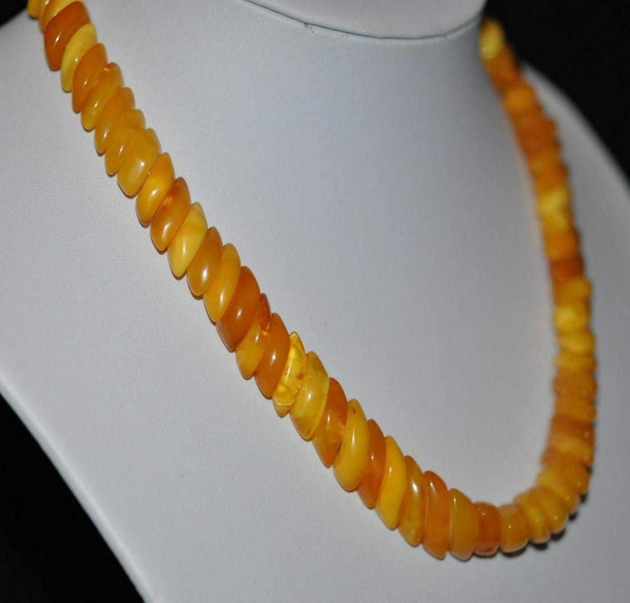 Antique Natural Butterscotch Egg Yolk Amber Necklace; Measurements: the length is 48 centimeters the biggest amber measures 21 x 10 x 5 mm; Weight is 36.7 grams