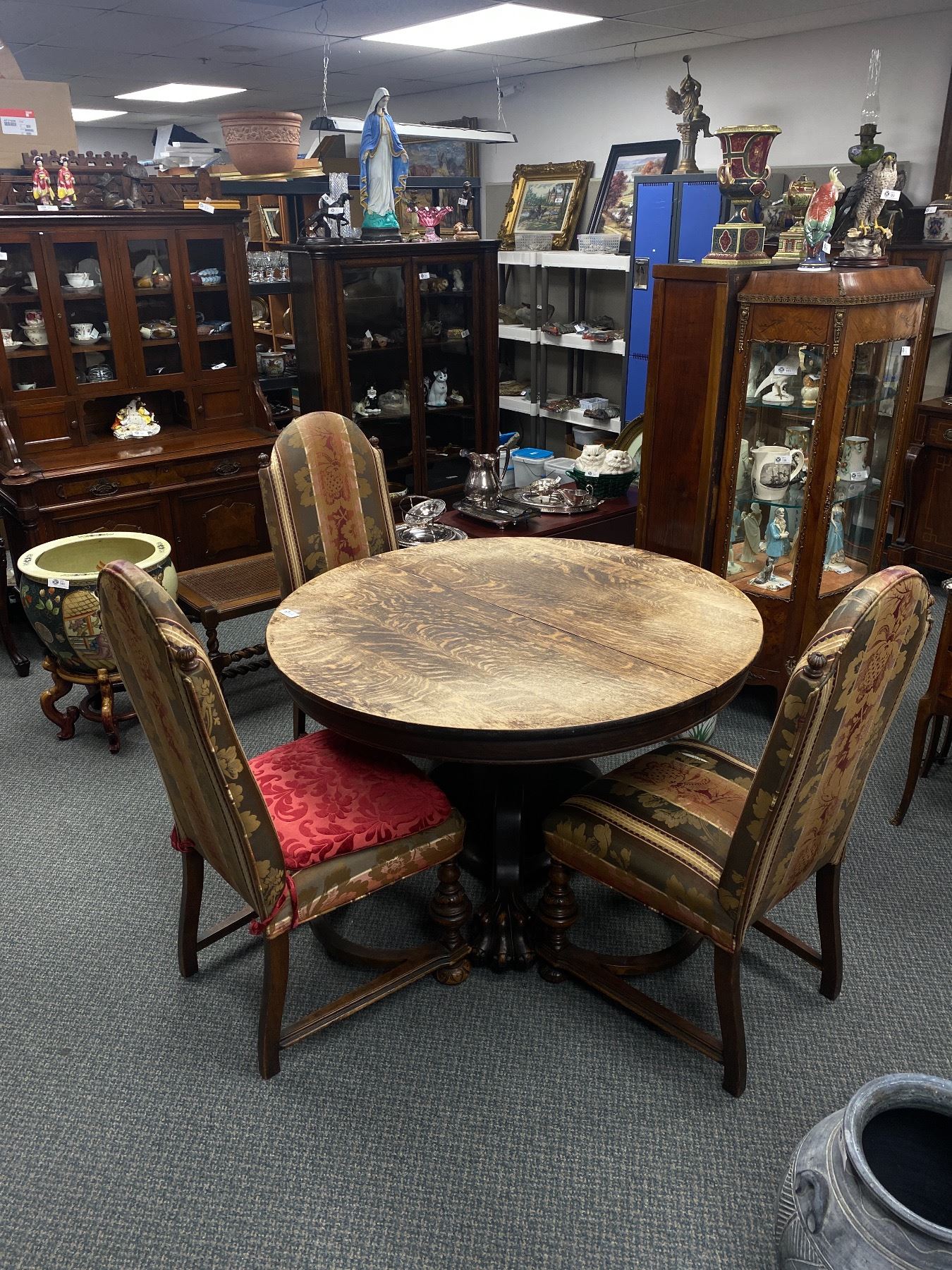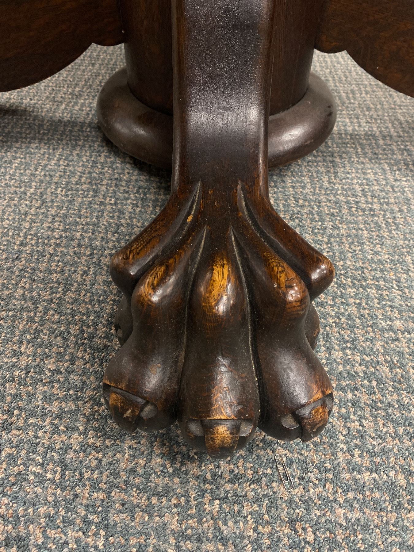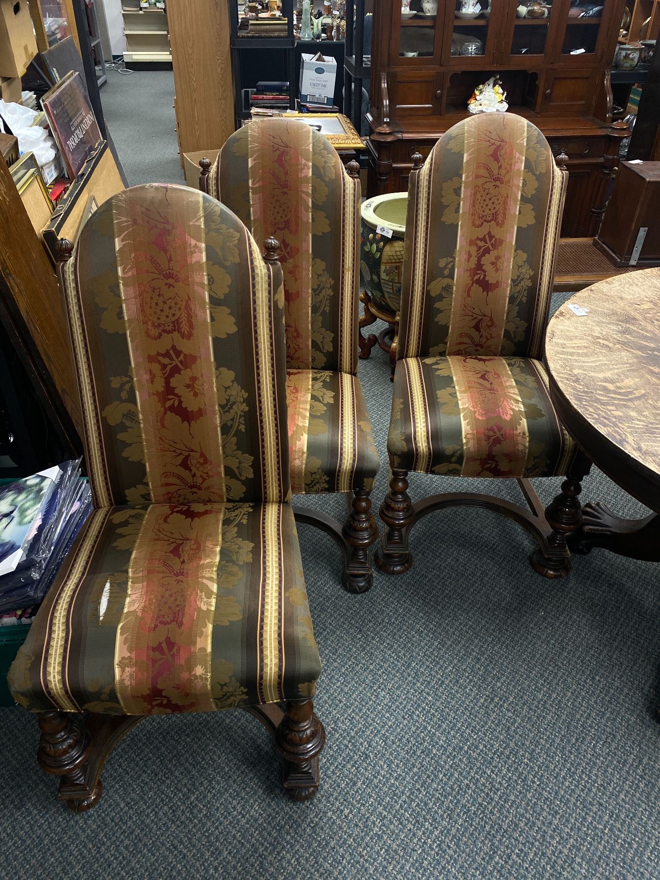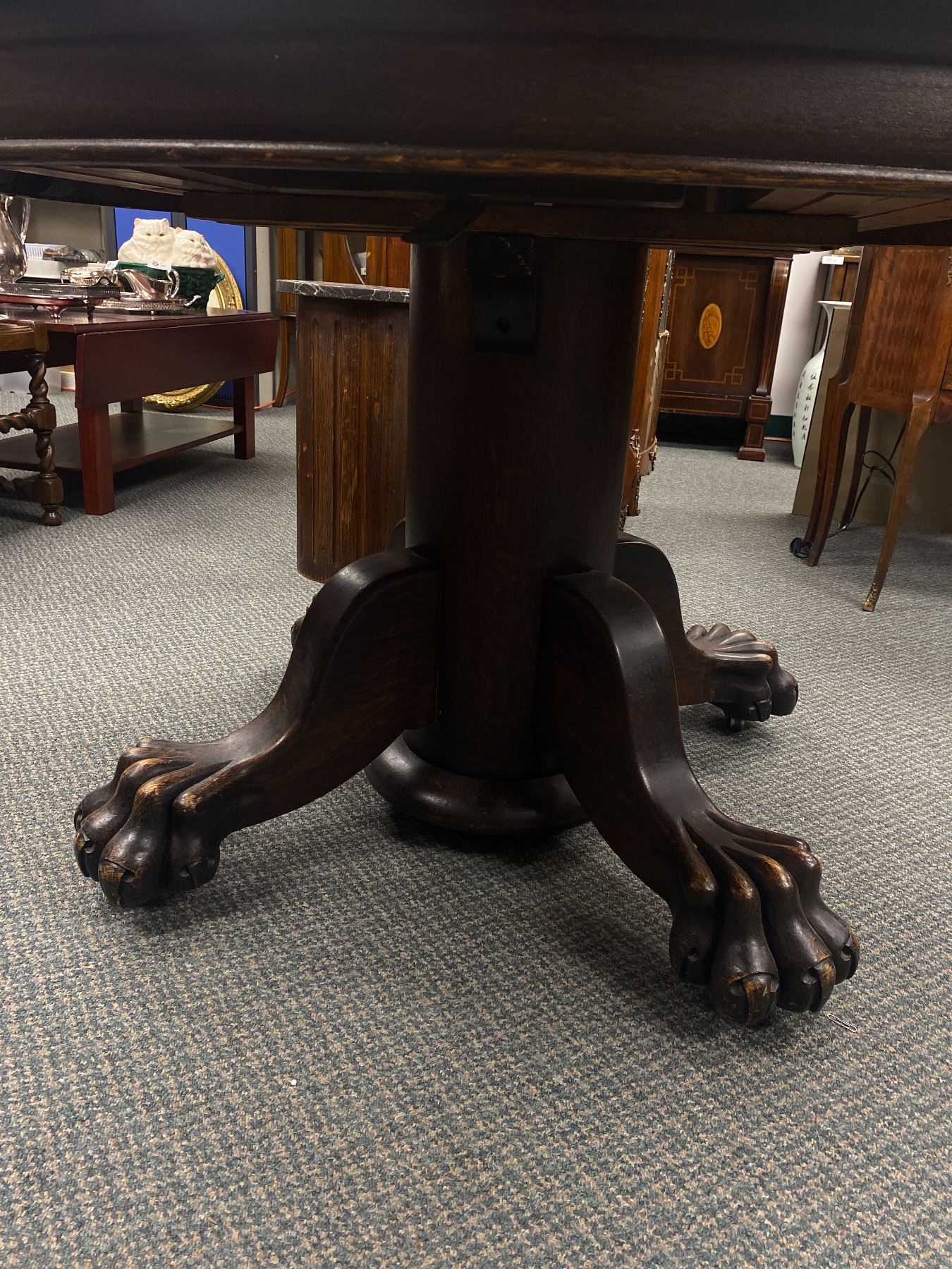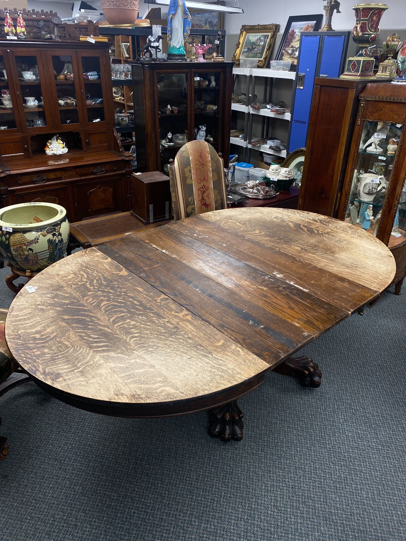 Antique Solid Wood 48 Diameter Dinning Table Without Leaf's ( 75" With Leafs) With Big Beautiful Claw Feet, and 3 Upholstered Chairs. Chairs Show Wear. Table Top Needs Refinishing.