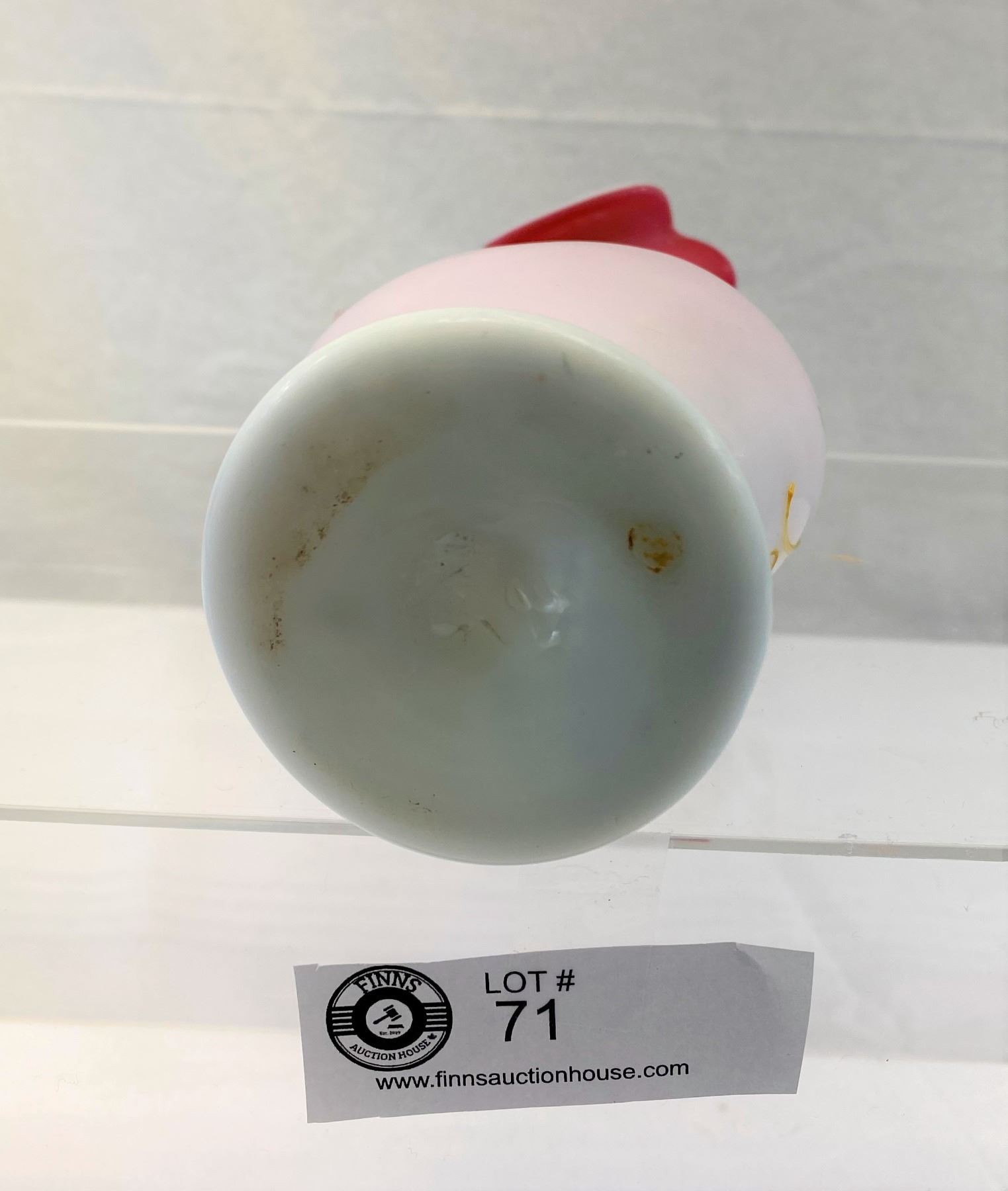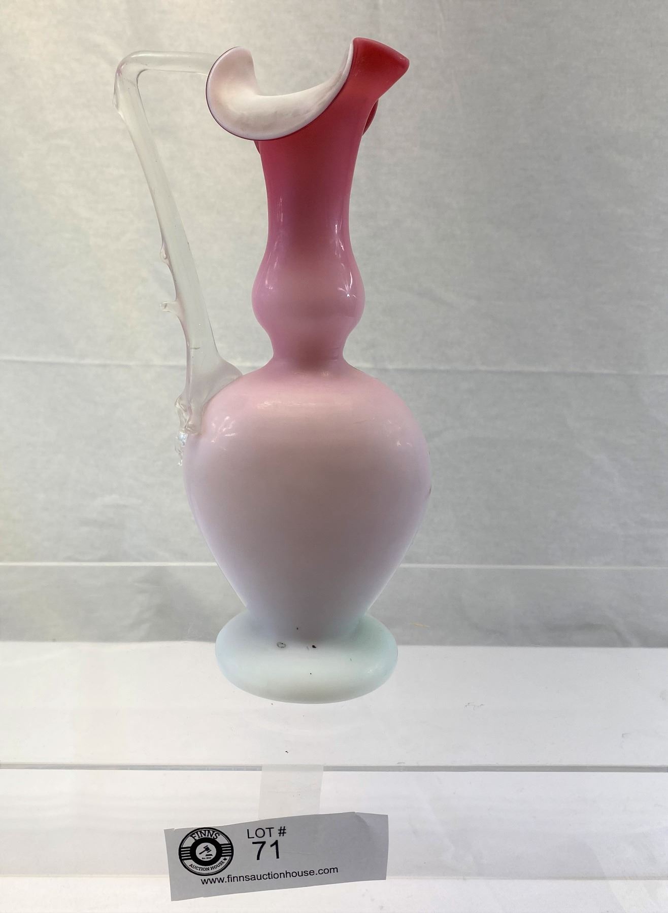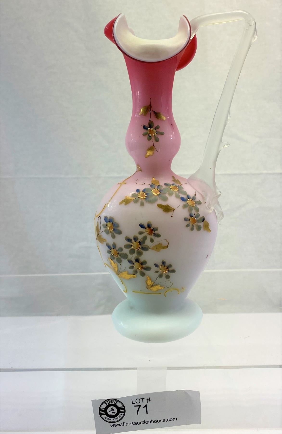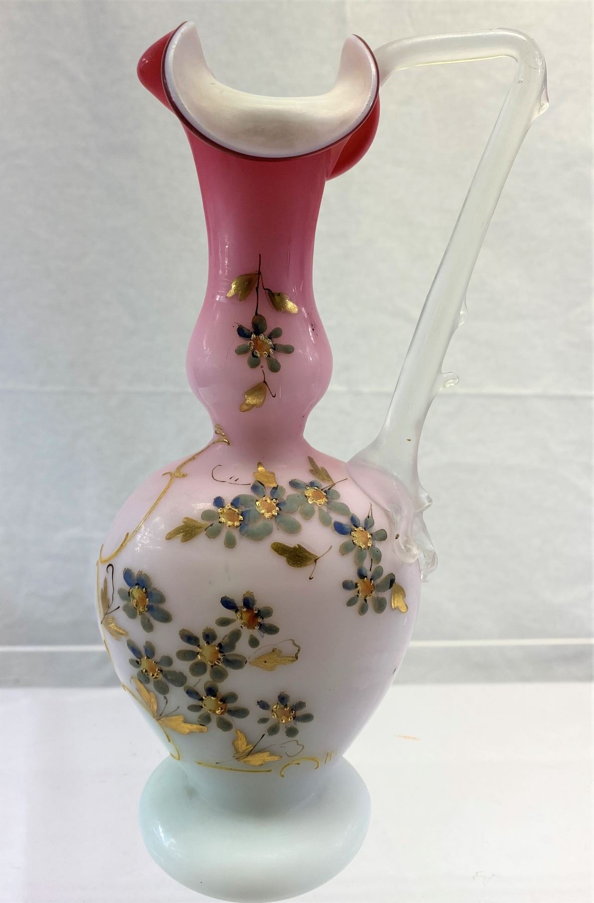 Antique Victorian Satin Glass Ewer Ore Vase, Hand Painted With Blue Flowers And Gold Leaves, No Cracks/Chips, Beautiful Piece Of Victorian Glass, 9"T