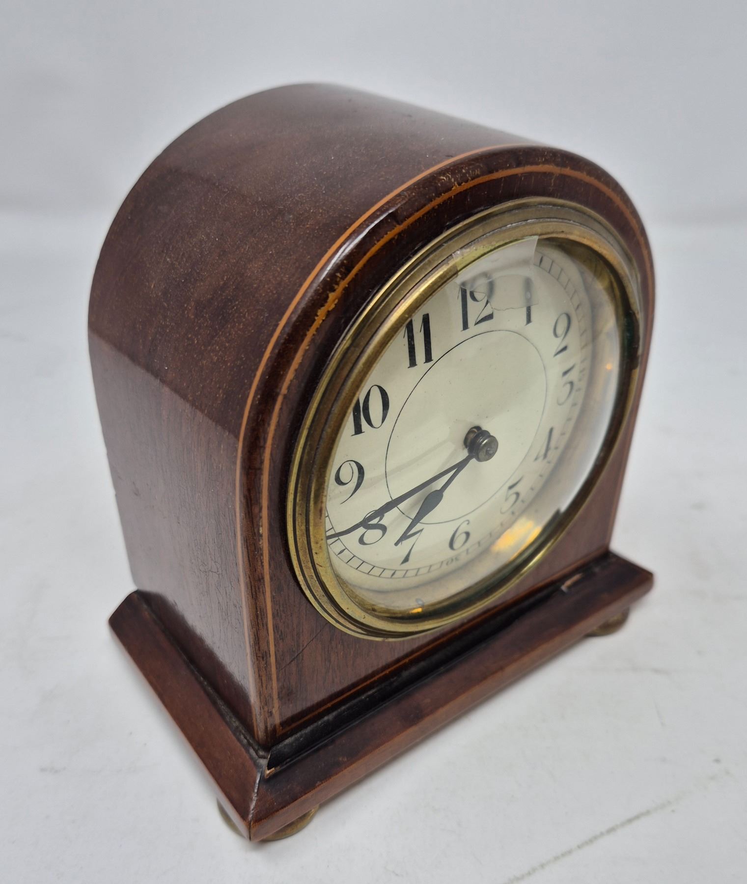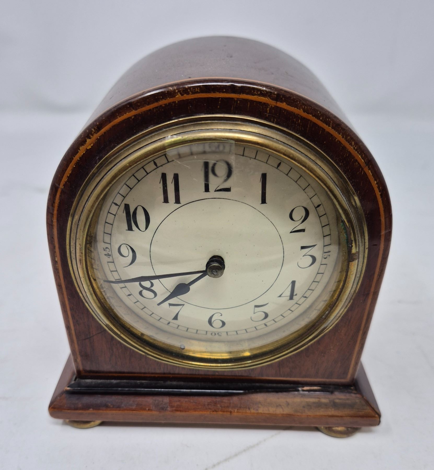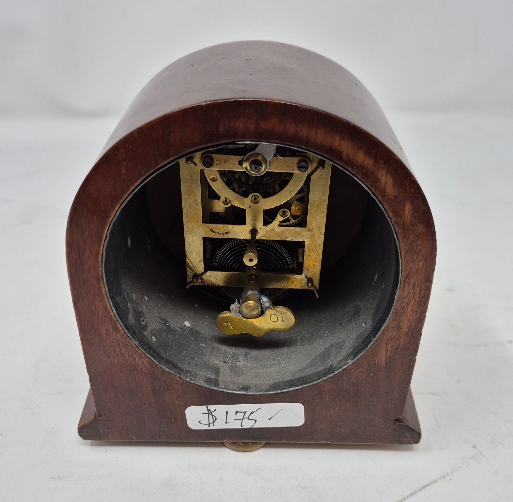 Charming antique mantel clock with visible brass movement and wind-up key. Rich wooden casing with classic round face. Working condition not tested.