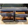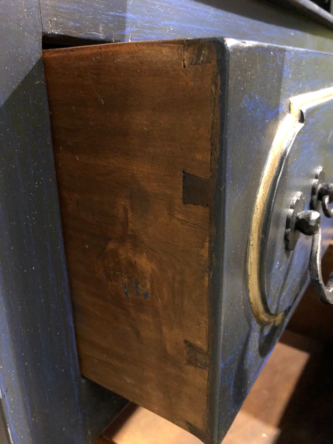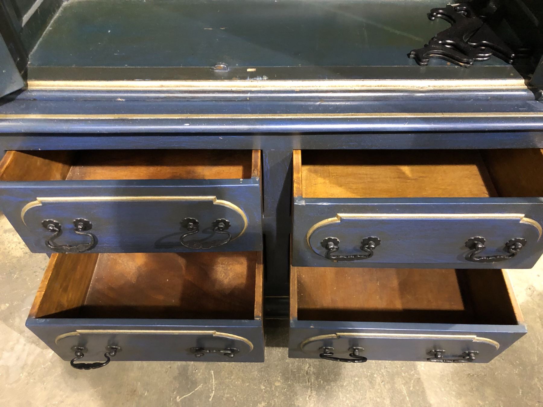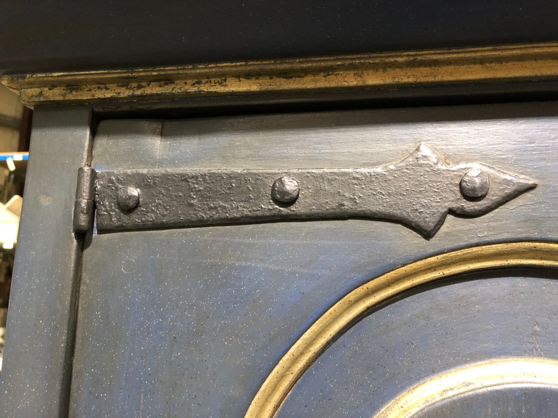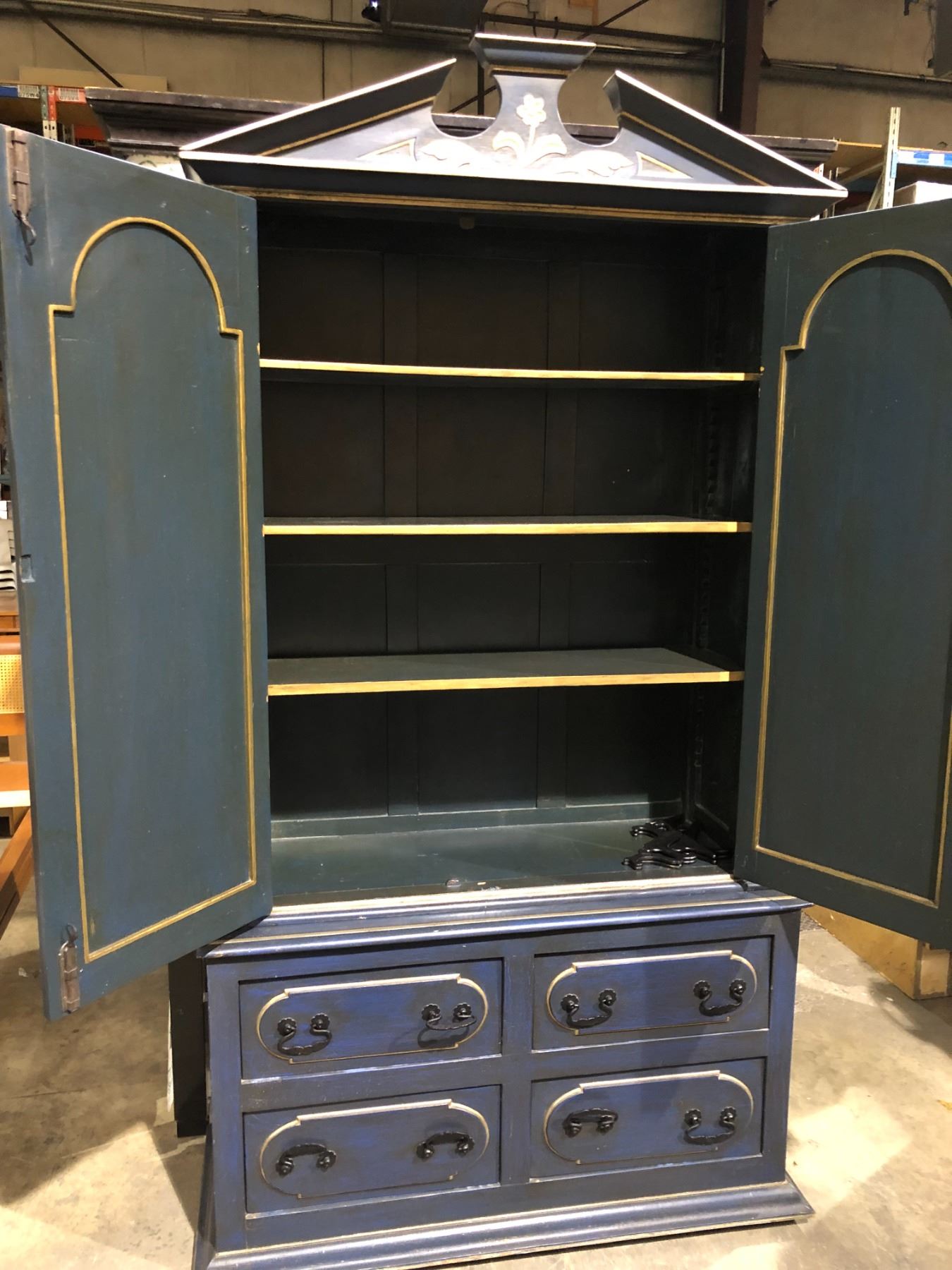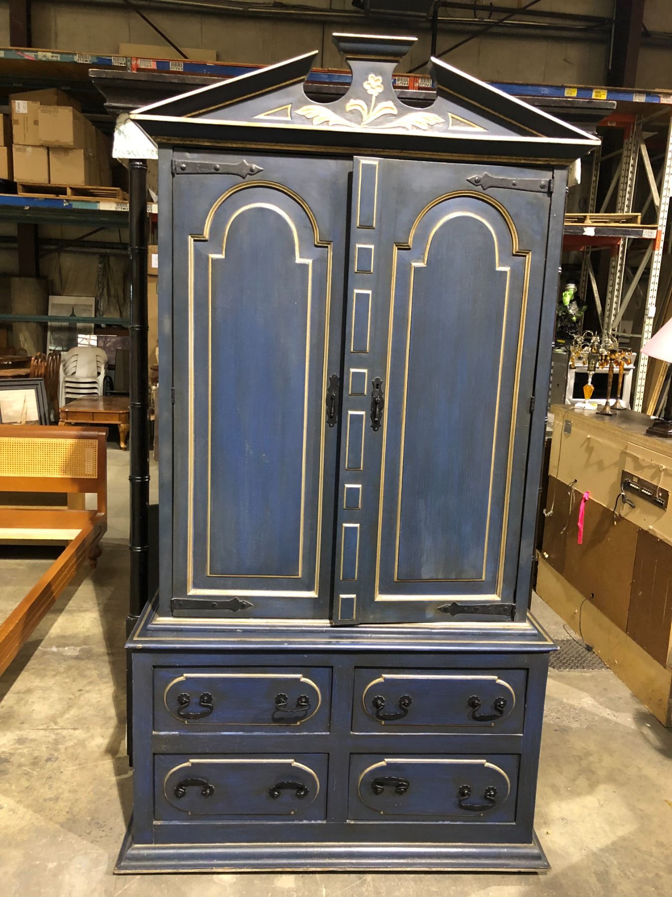 Antique approx. 7ft tall wardrobe/ storage cabinet painted blue w/ silverish trim & rot iron accents w/ 4 drawer bottom storage