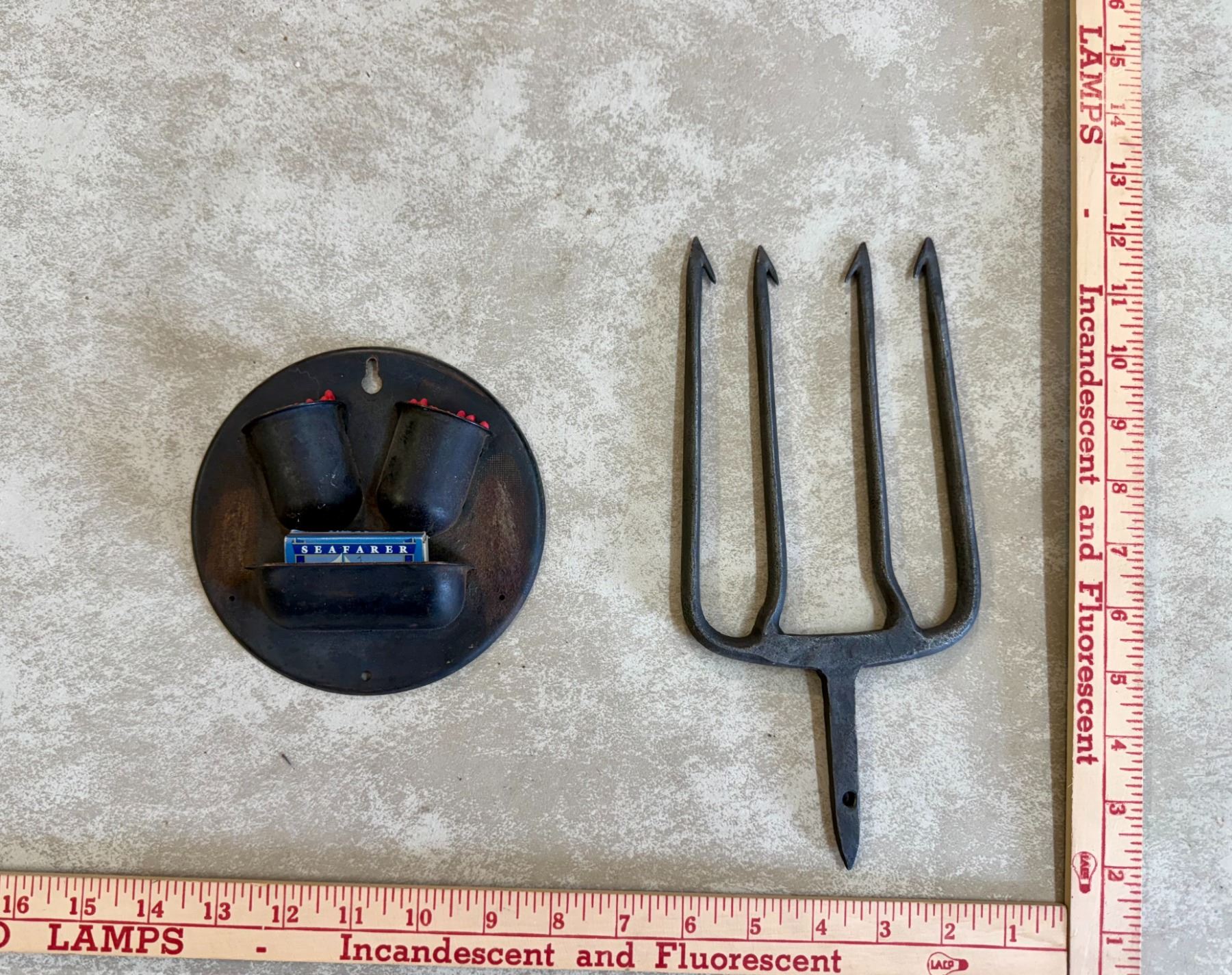 Antique iron match holder + Antique Fish / Eel / Frog gig