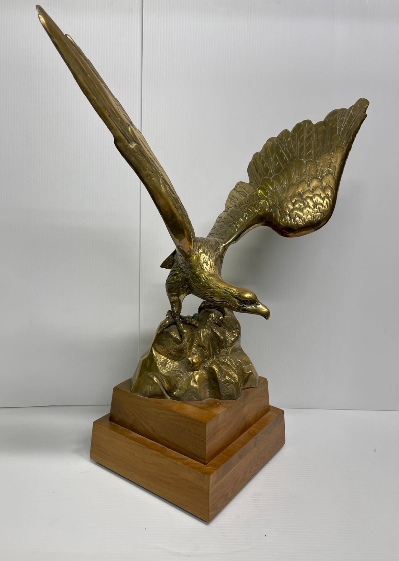 Approx. 26in tall brass bald eagle decorative sculpture w/ wooden base
