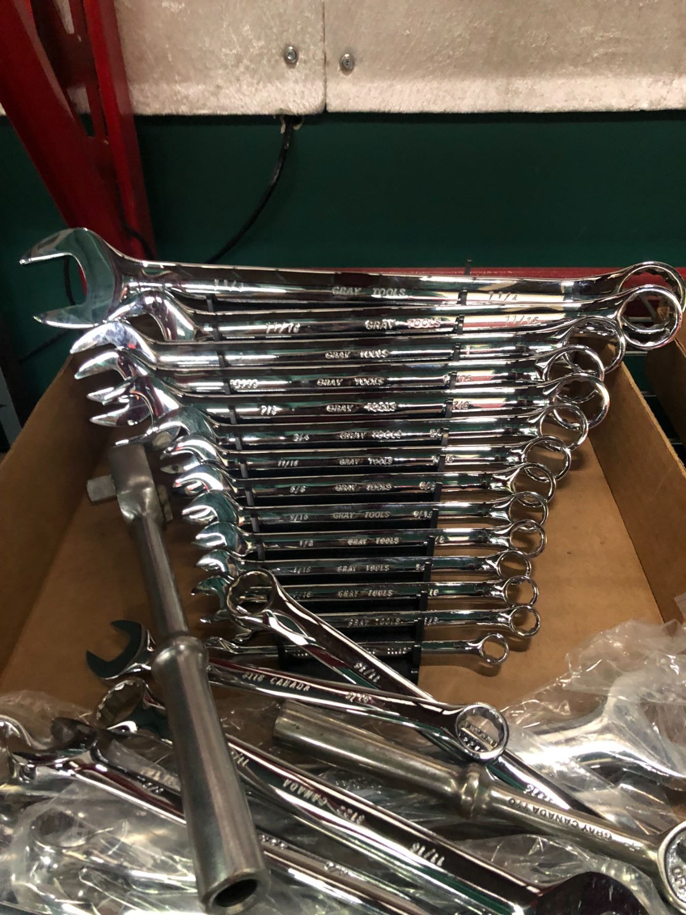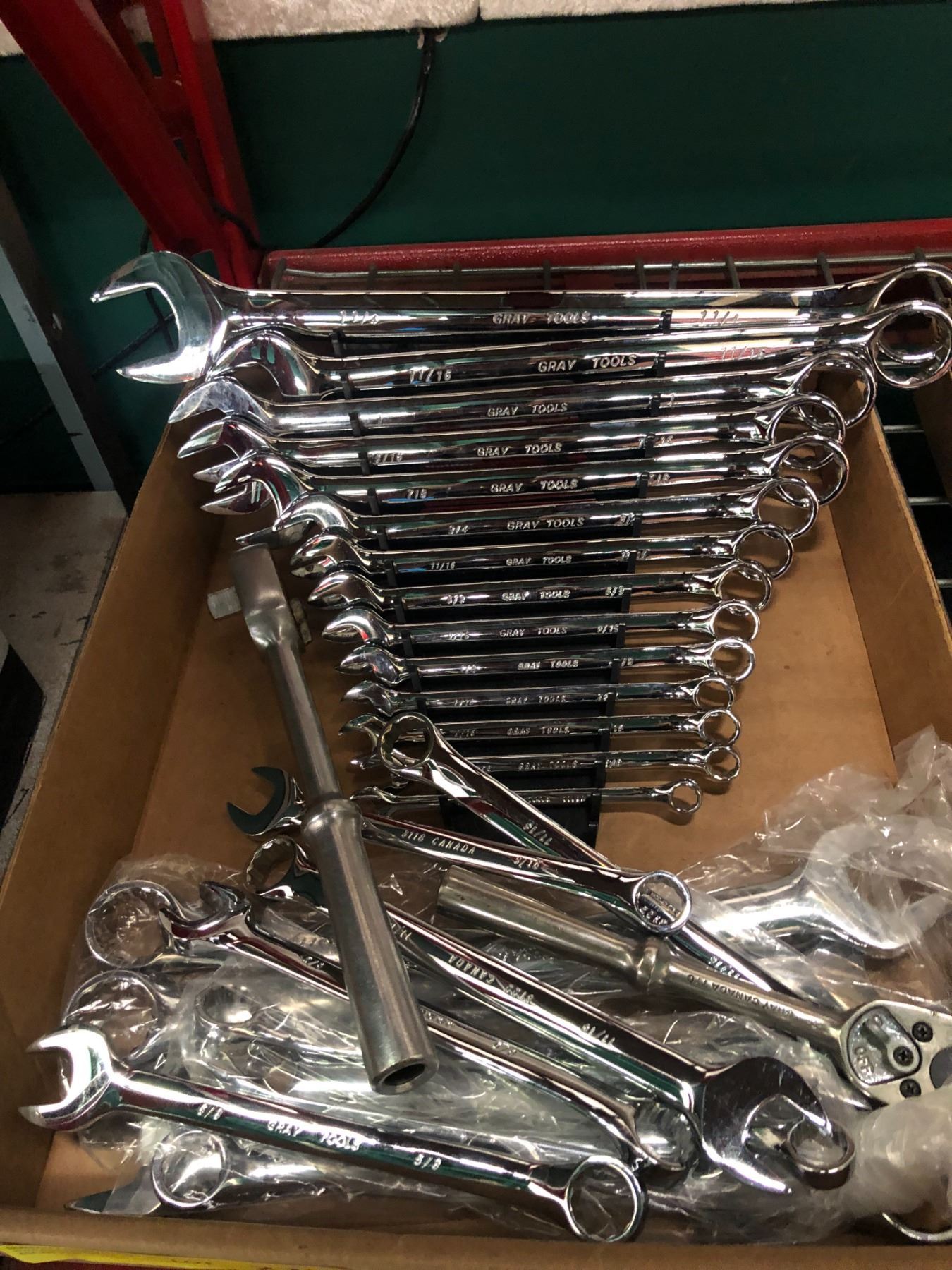 Approx. 30 pcs. Gray combination wrenches & ratchets (imperial up to 1 & 1 3/4in)