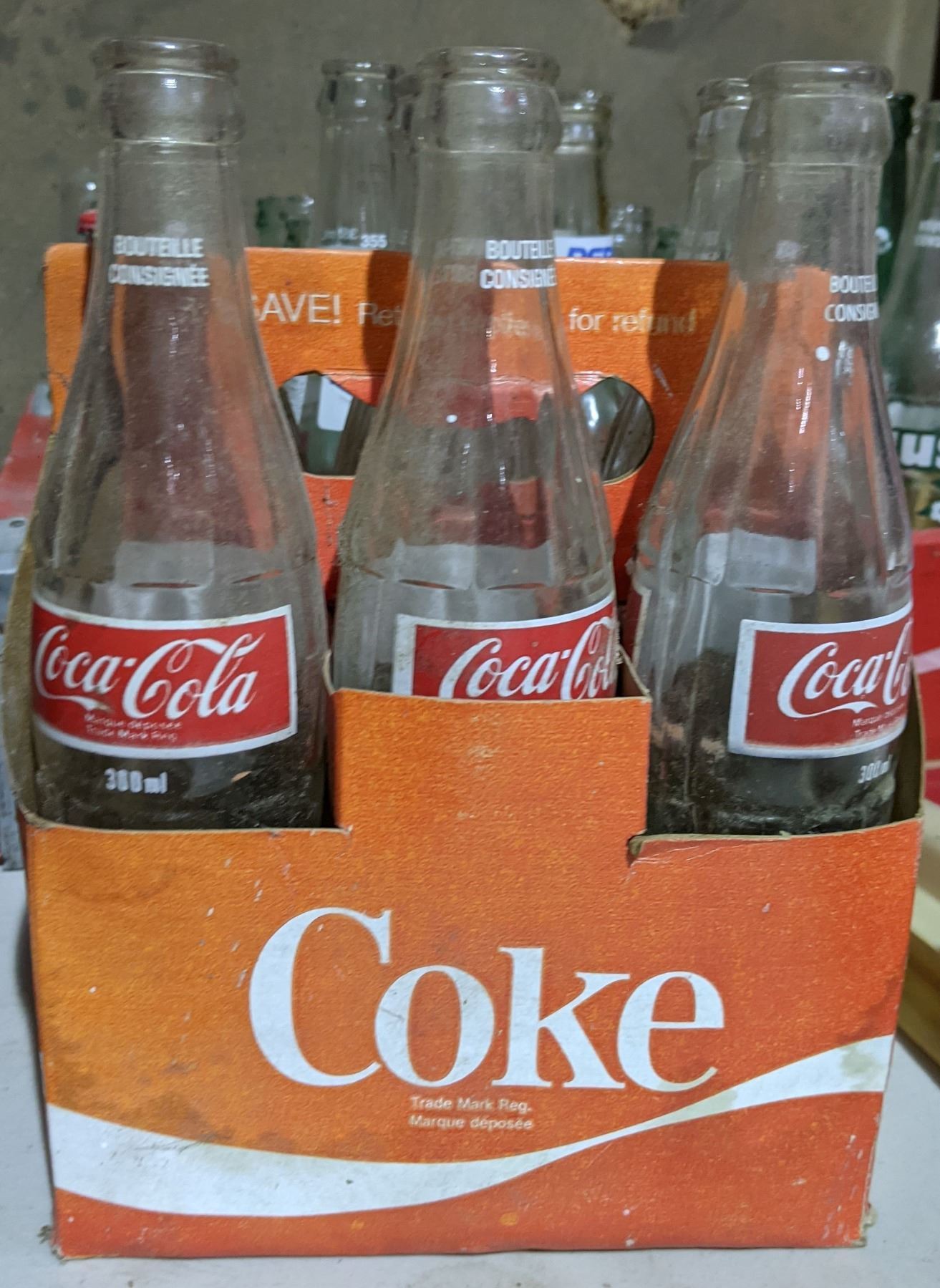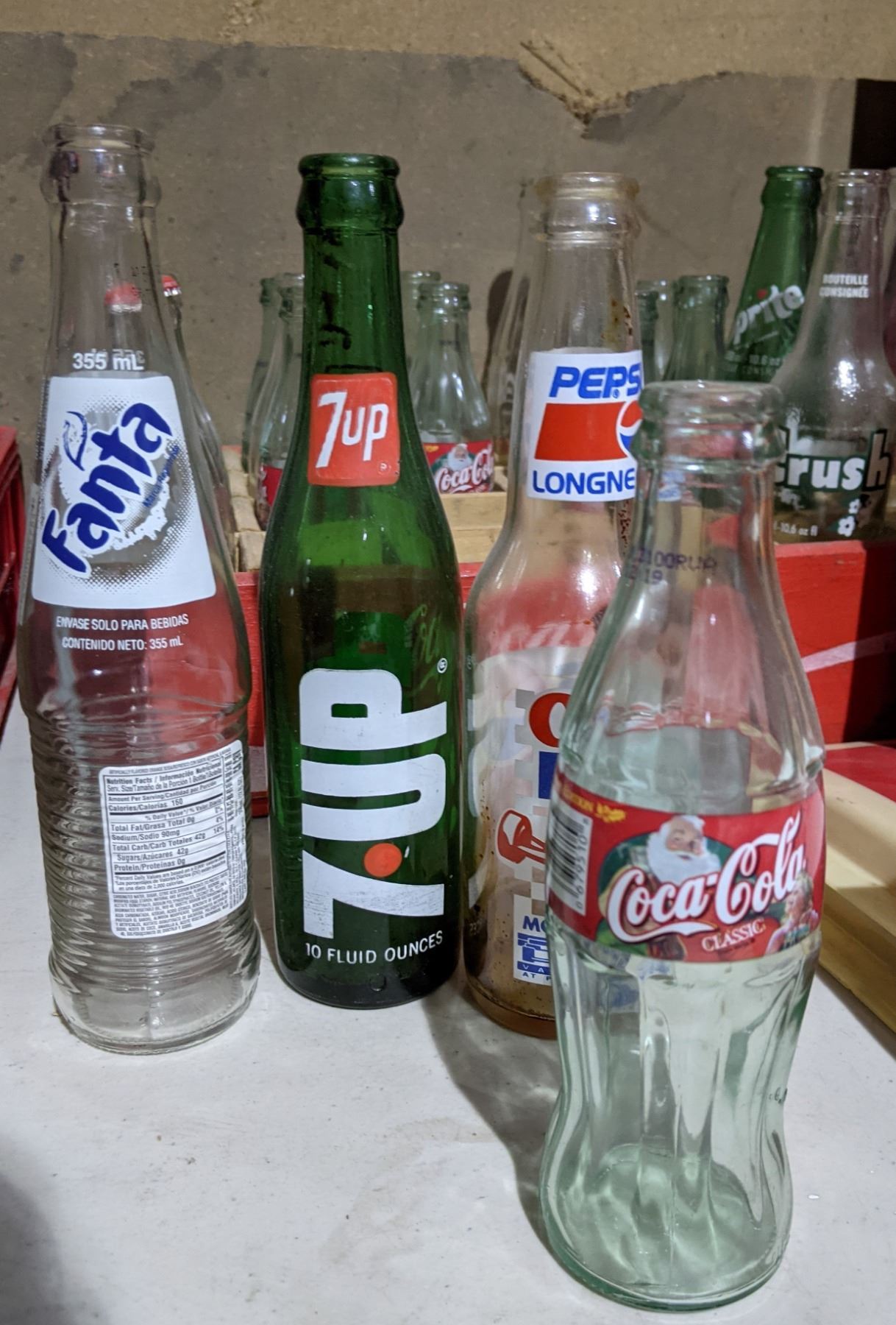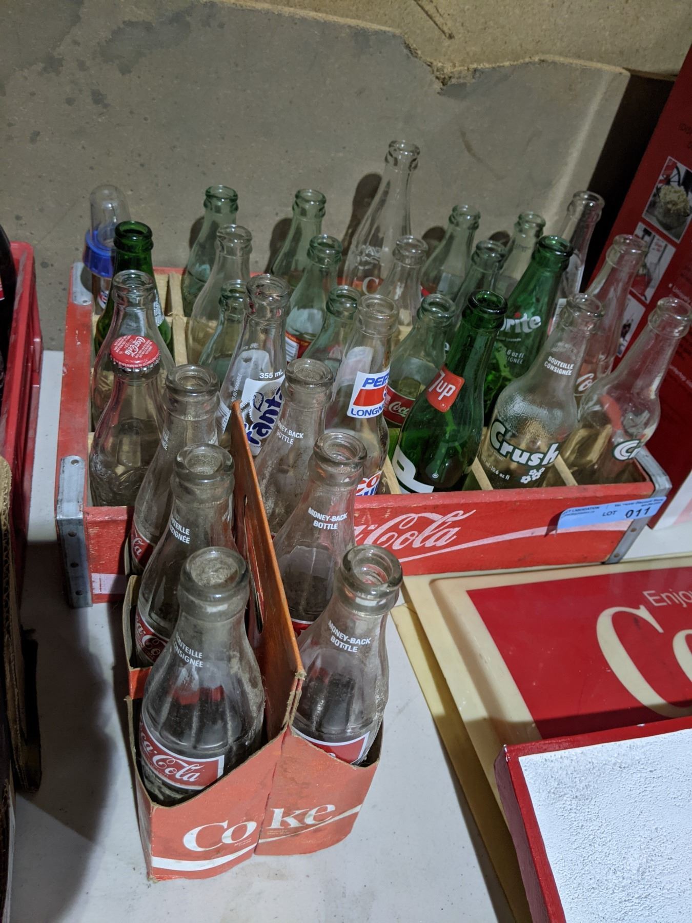 Approx. 30 vintage empty Coca Cola, Pepsi, 7Up, Fanta, Crush bottles with vintage wooden crate
