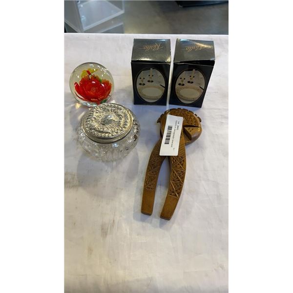 Butterfly art glass paperweight, carved wood nutcracker , sterling lidded jar and rialto candle holders