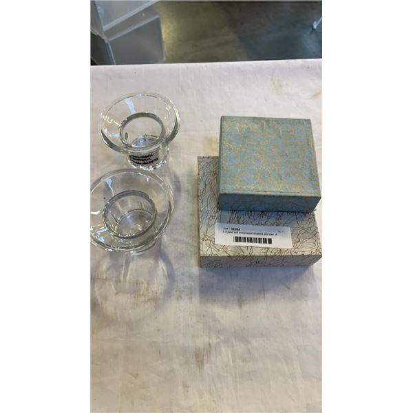 2 crystal salt and pepper shakers and pair of denmark crystal candle holders