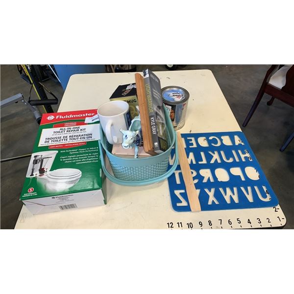 FLUIDMASTER UNIVERSAL ALL IN ONE TOILET REPAIR KIT AND RED DELICIOUS PAINT AND LETTER STENCIL AND MUGS