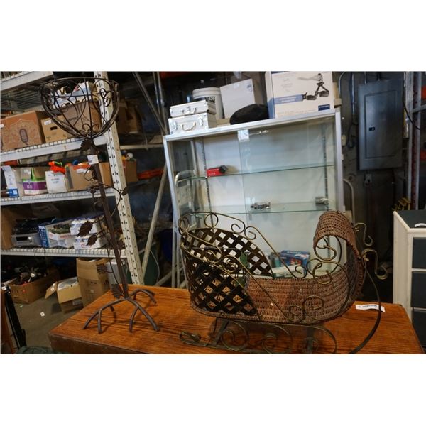 METAL PLANTER STAND AND METAL AND WICKER SLEIGH DECORATION