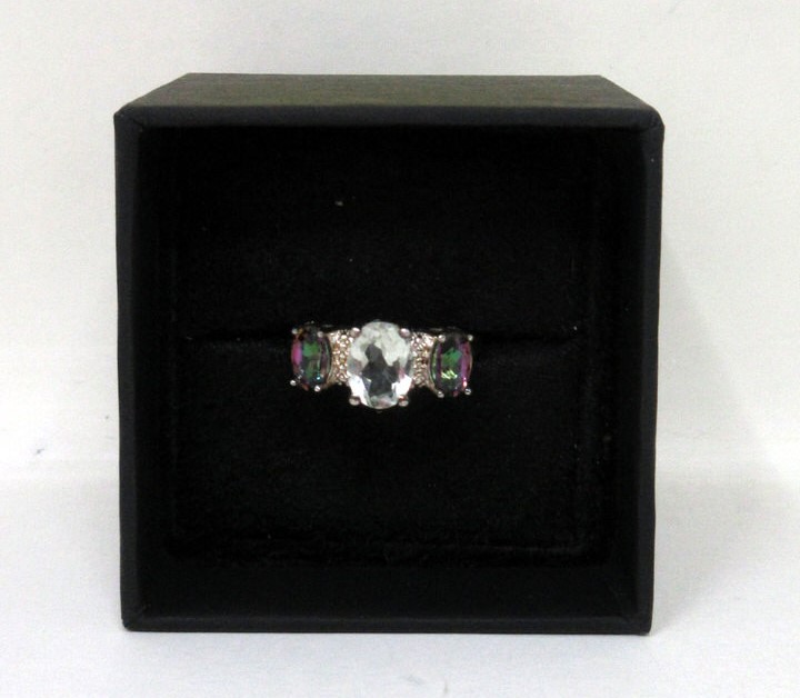 Sterling silver setting. 2 diamonds. 6x8 mm Aquamarine. Two 4x4 mm Mystic Topaz.