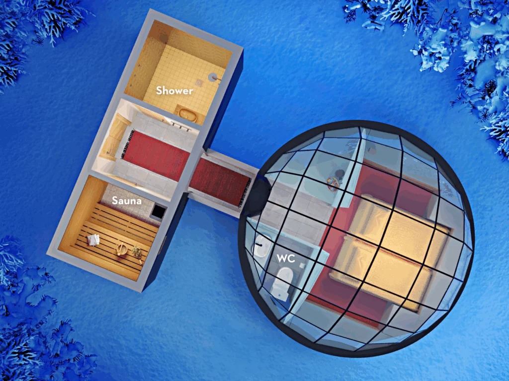Bedding in the small glass igloo includes two single beds and the cabin includes one double.