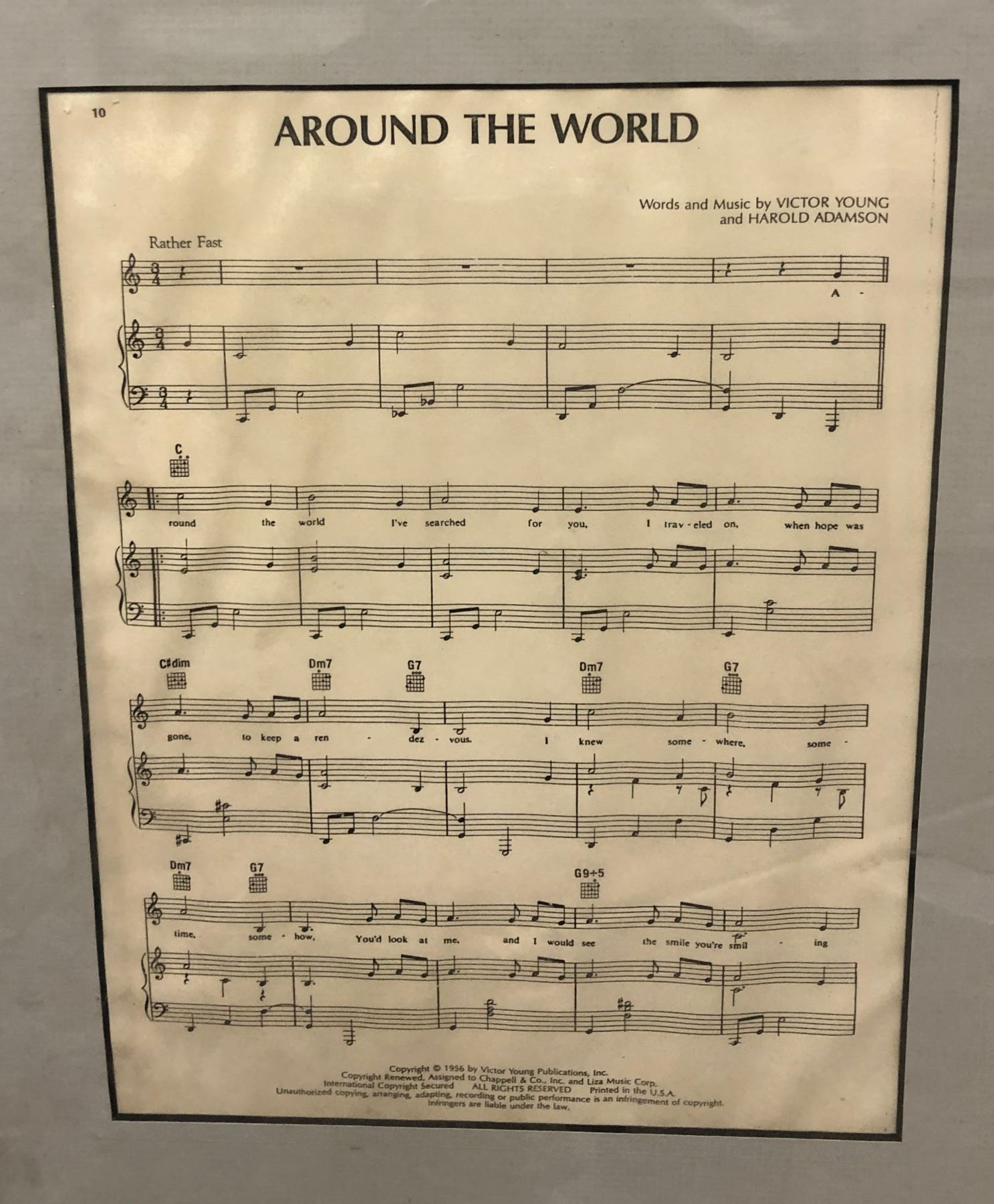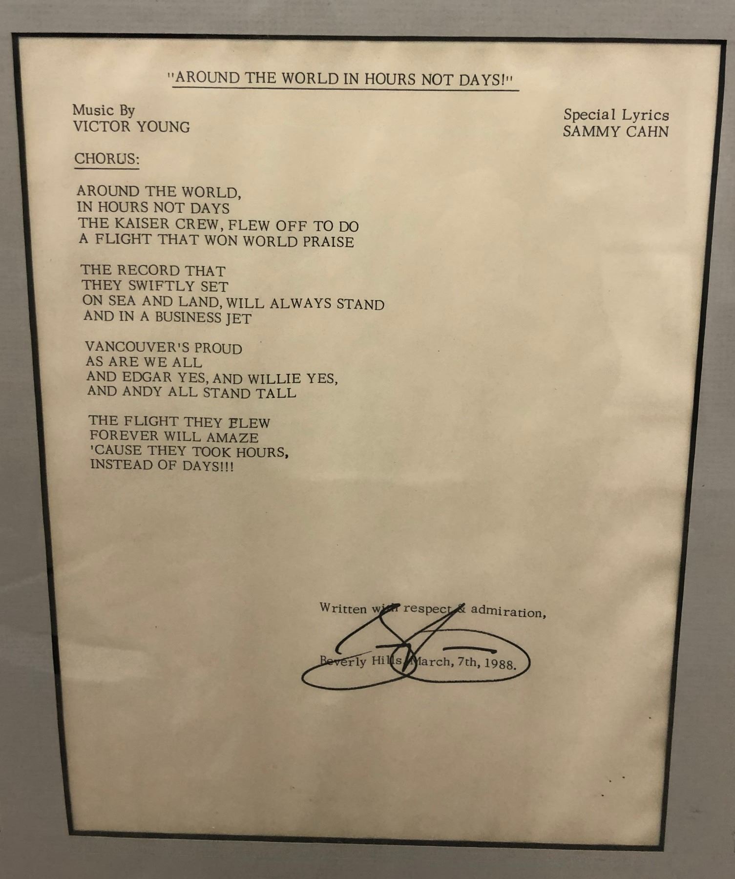 Around The World in Hours not Days - Musical Notes from the Edgar Kaiser Collection. Signed by Sammy Chan with Music by Victor Young and Harold Adamson. Approximately 31 x 16"
