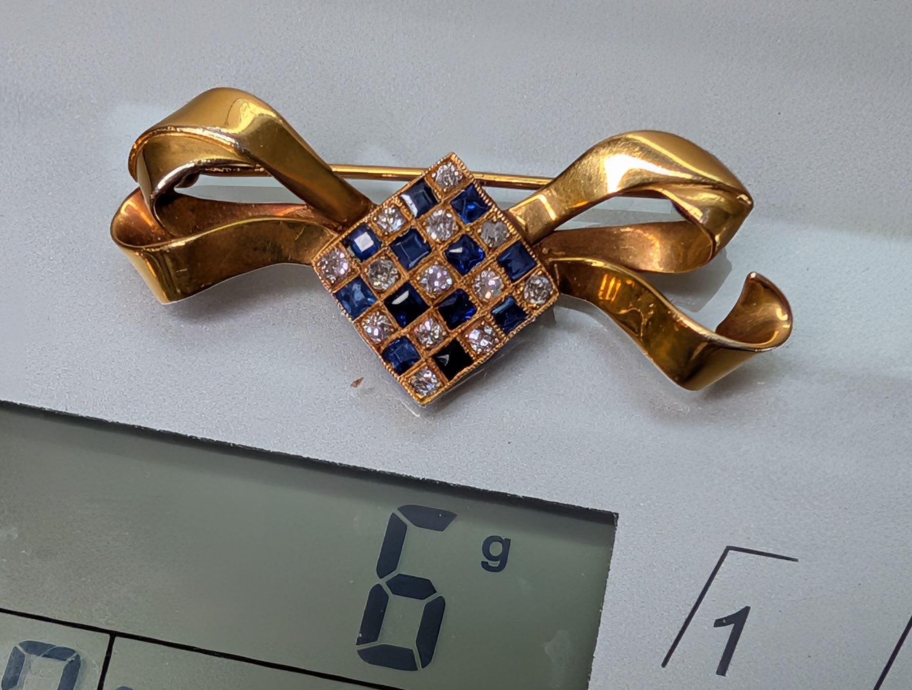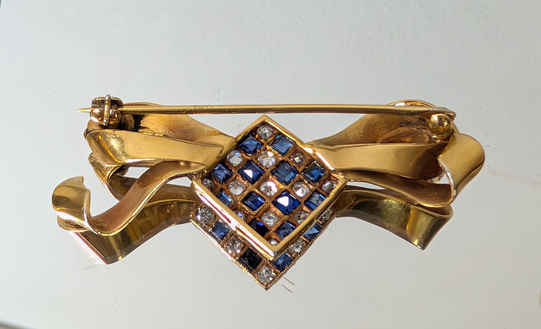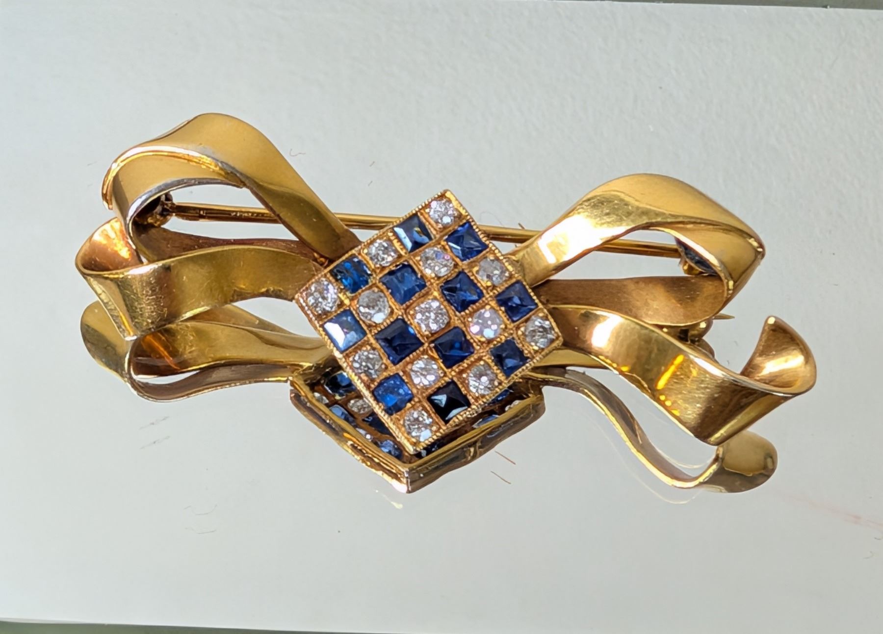 Art Deco 18k yellow gold Bow Brooch with diamonds and sapphires