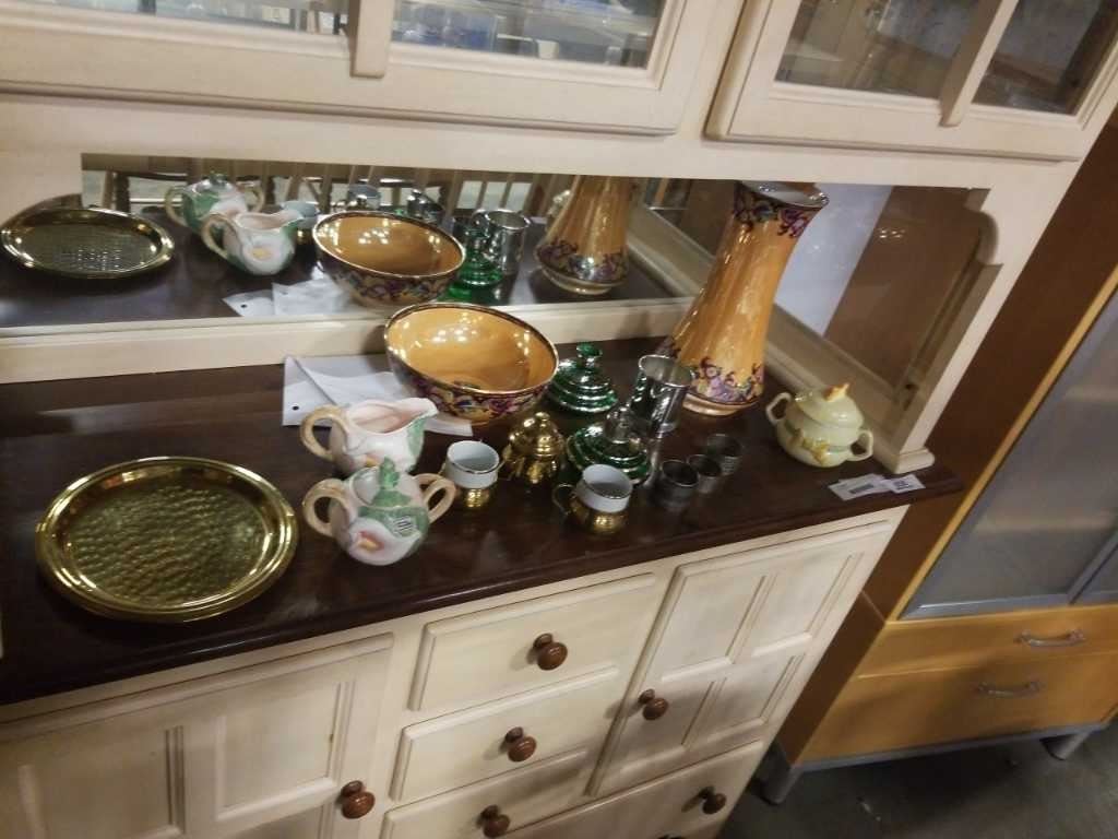 Art glass vase, Victorian dresseer set, lidded sugar bowl, silver plate napkin rings, SP baby tumbler and 6 pc brass cappachino set