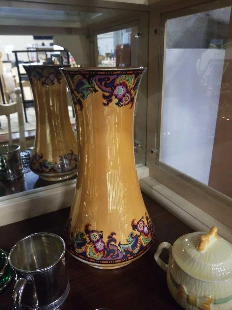 Art glass vase, Victorian dresseer set, lidded sugar bowl, silver plate napkin rings, SP baby tumble