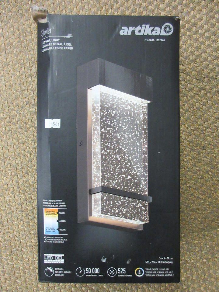 5.5" x 2.5" x 11.75". Dimmable. Open box.