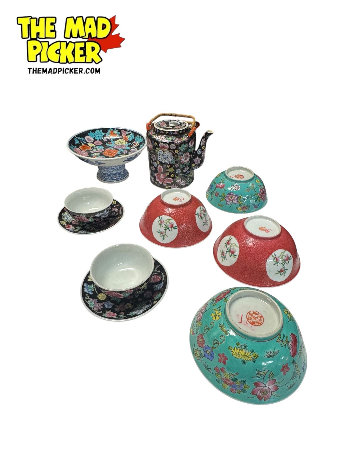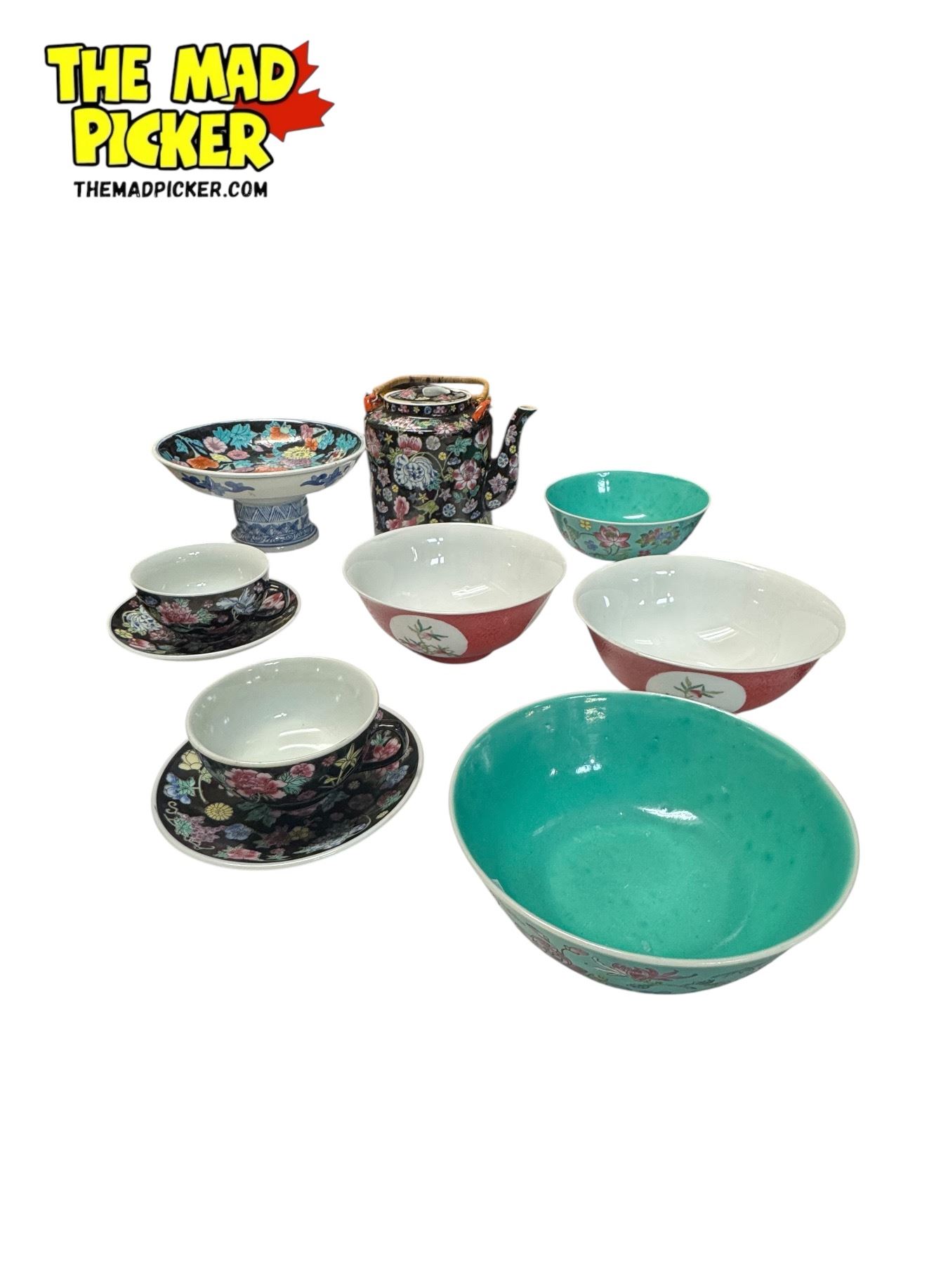 Asian Porcelain Collectibles: Bowls, Teapot, Pedestal Bowl, & Teacups + Saucers