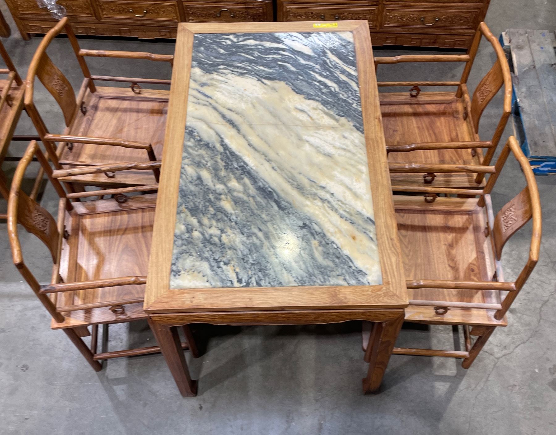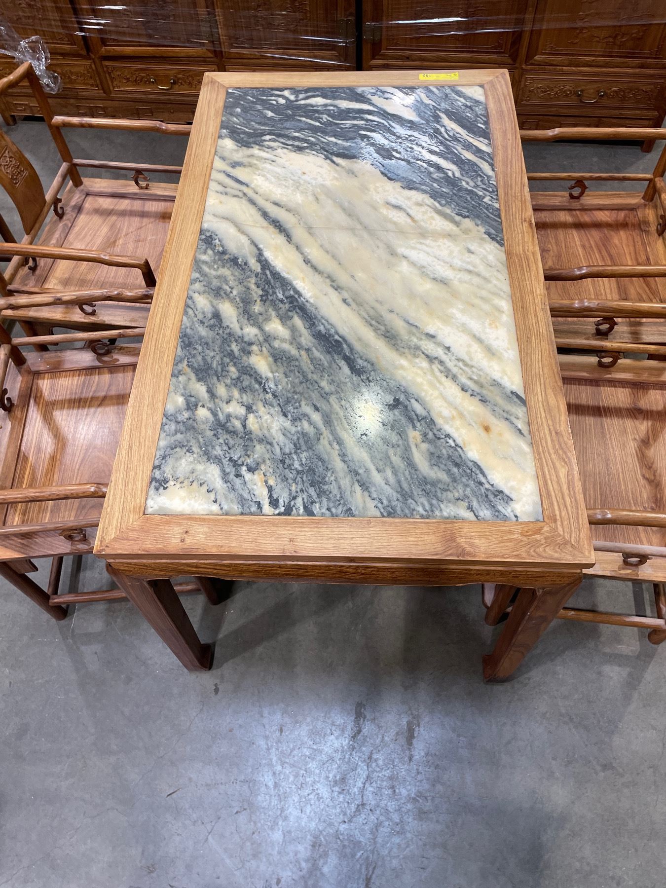 Asian Style Walnut Table w/ Marble inlayed top (54x32x31") & 4 Walnut Chairs