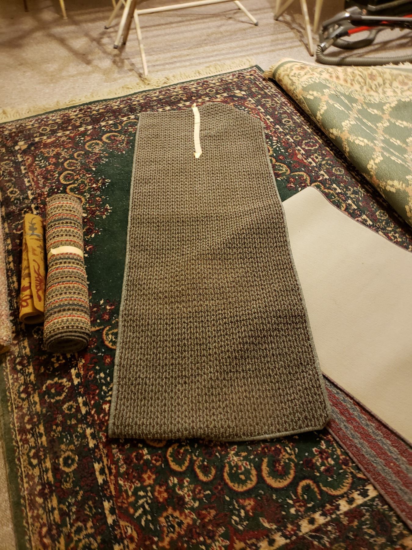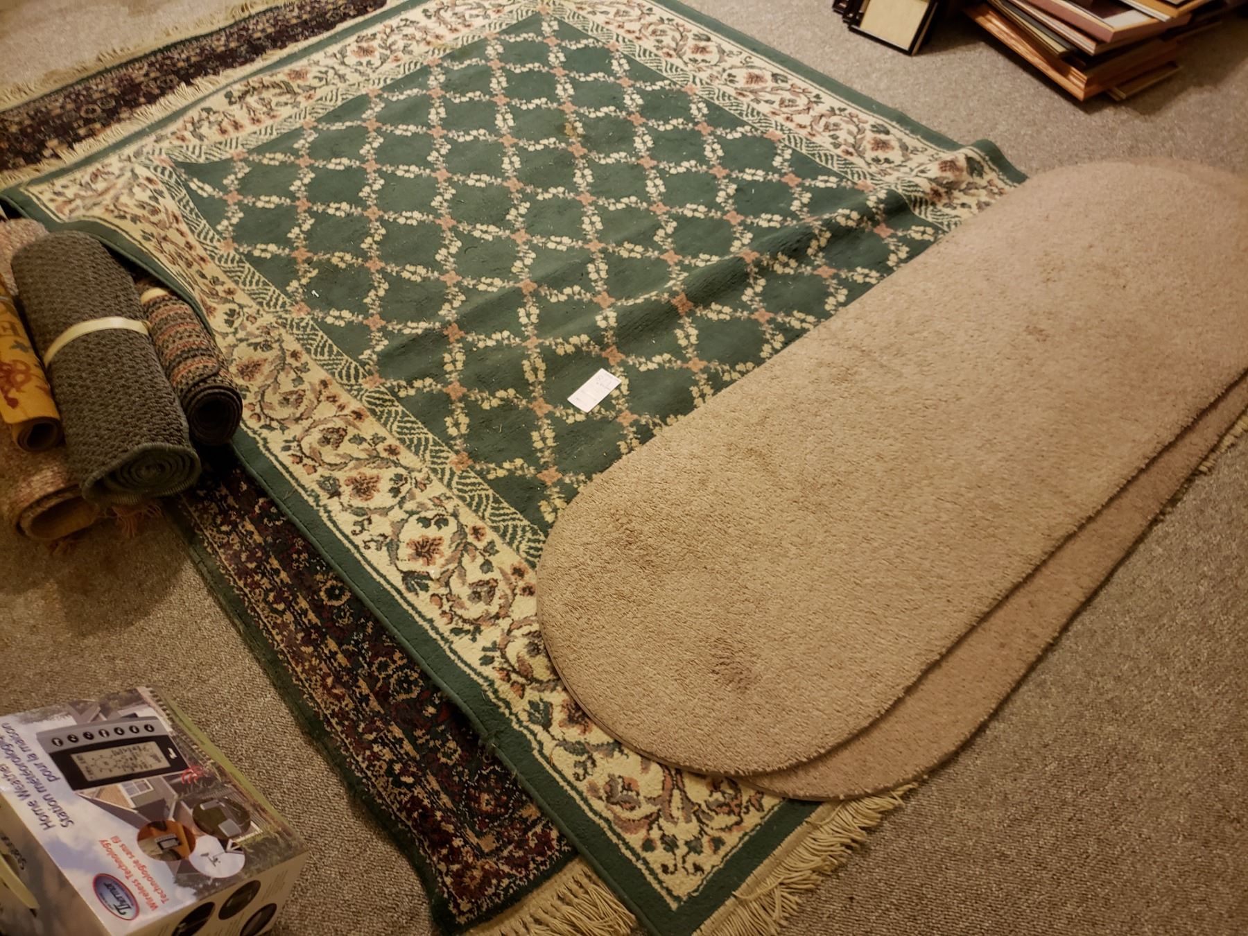 2 Area rugs about 90x60" each one green, note stains on green rug. Assortment of matts & hall runners of various sizes, colours & shapes. Come to pick up at Category C time slot (11:00 am - 12:00 pm)