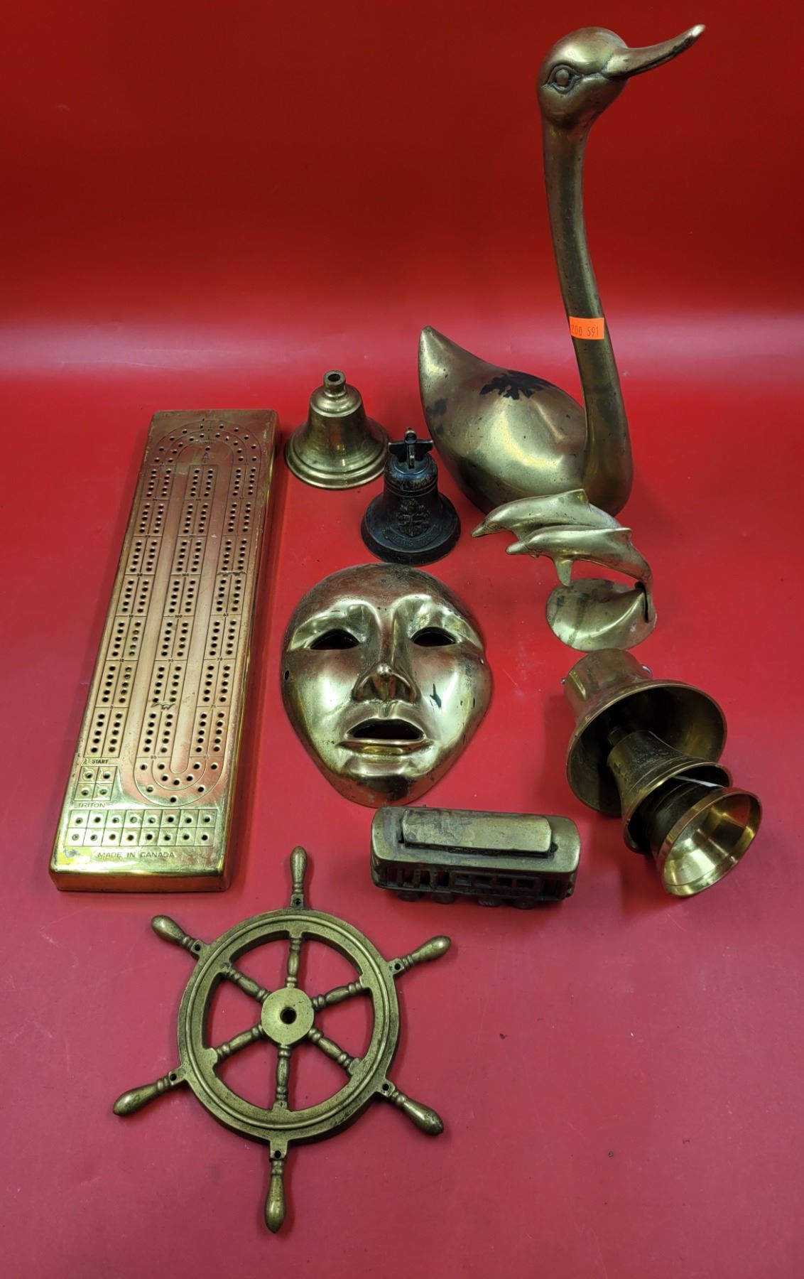 Assorted Brass Lot w/ Mask, Crib Board Made in Canada, Figurines, & More