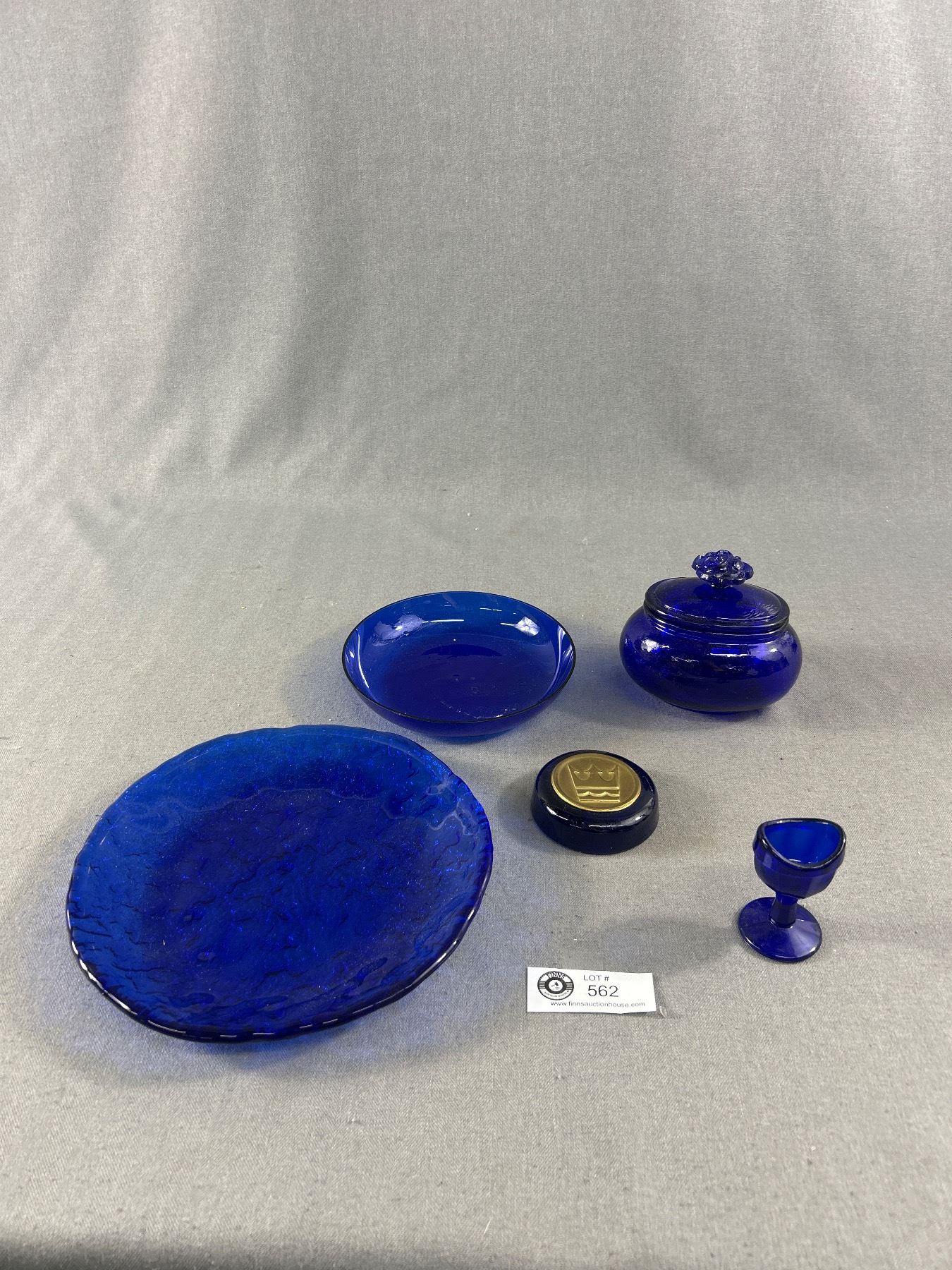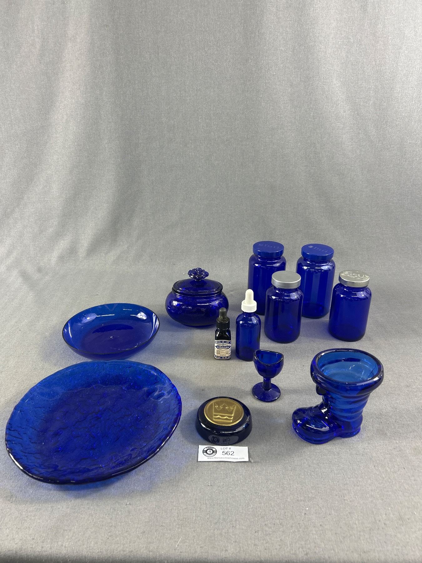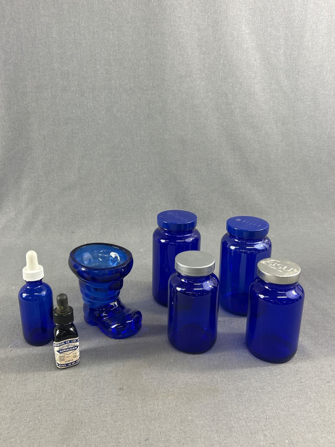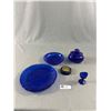 Assorted Cobalt Blue Glass - Jars, Plate, Bowl, Eye Bath & More