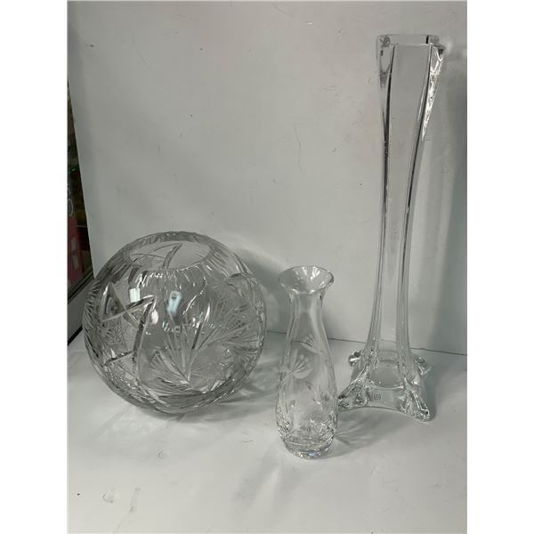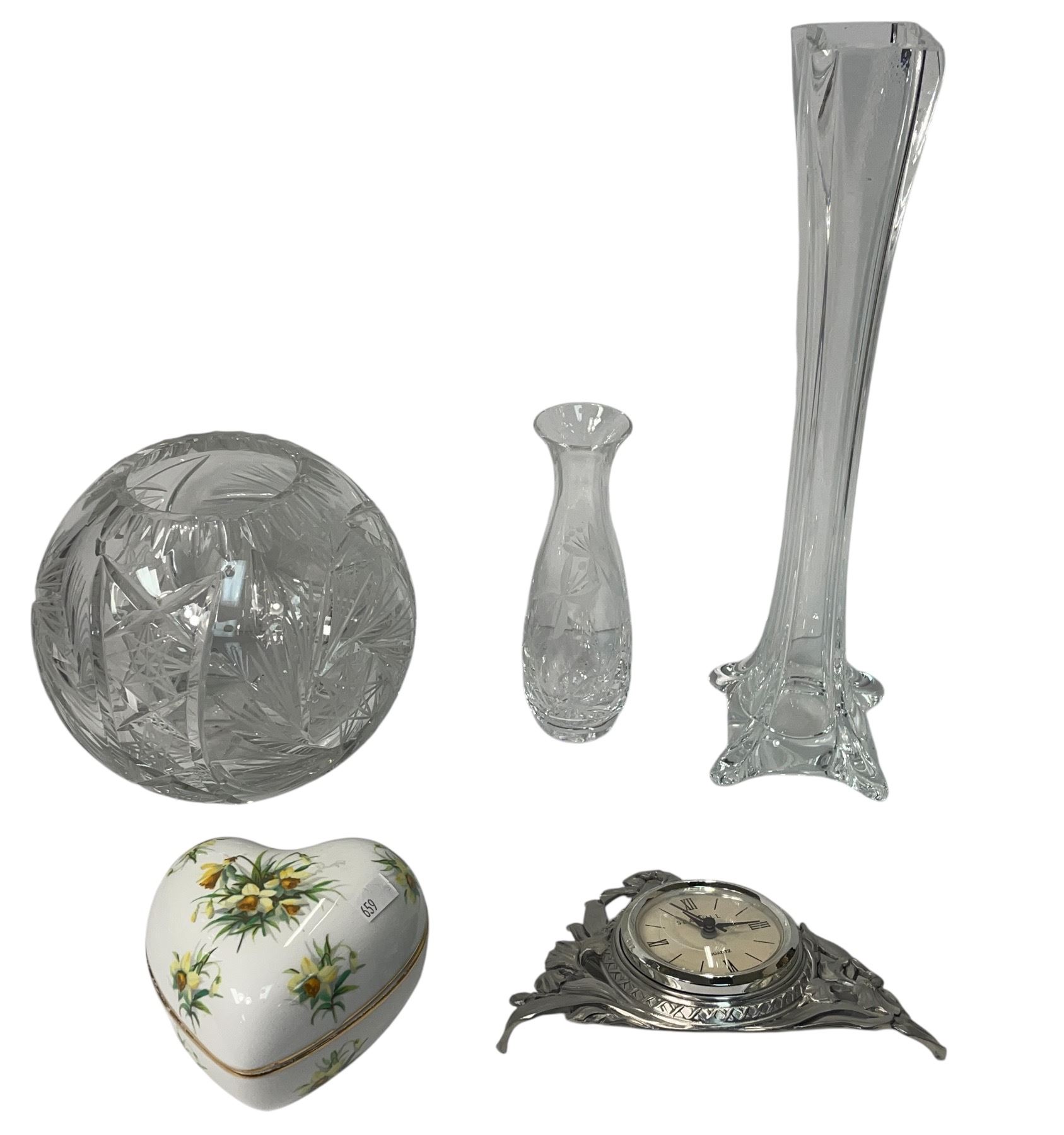 Assorted Collectibles, Hammersley Heart Shaped Trinket Box, Glass Vases, Glass Bowl & Desktop Clock