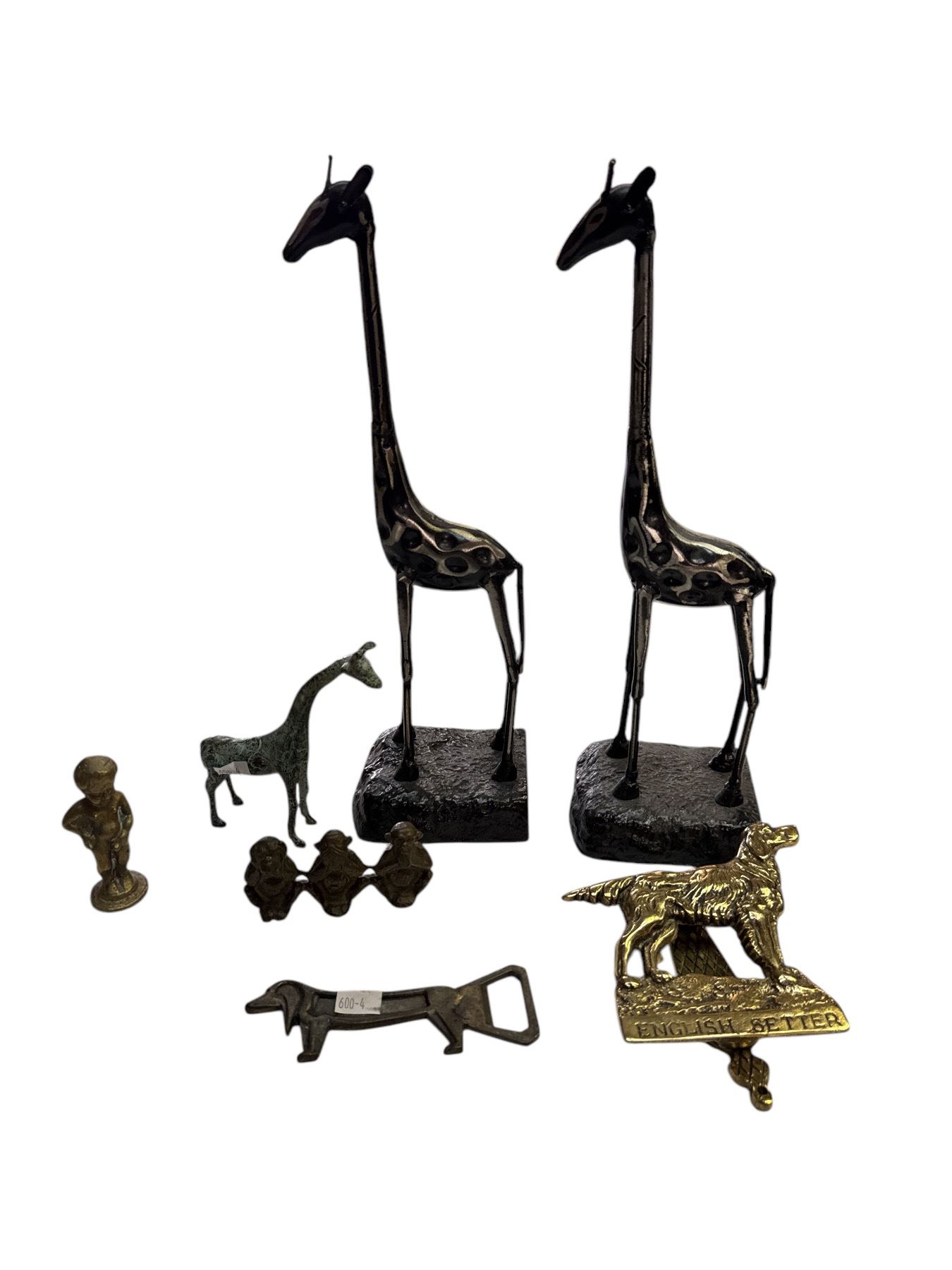 Assorted Collectibles: Metal Giraffes, Hear see Speak No Evil Monkeys, Weiner Dog Bottle Opener, & More