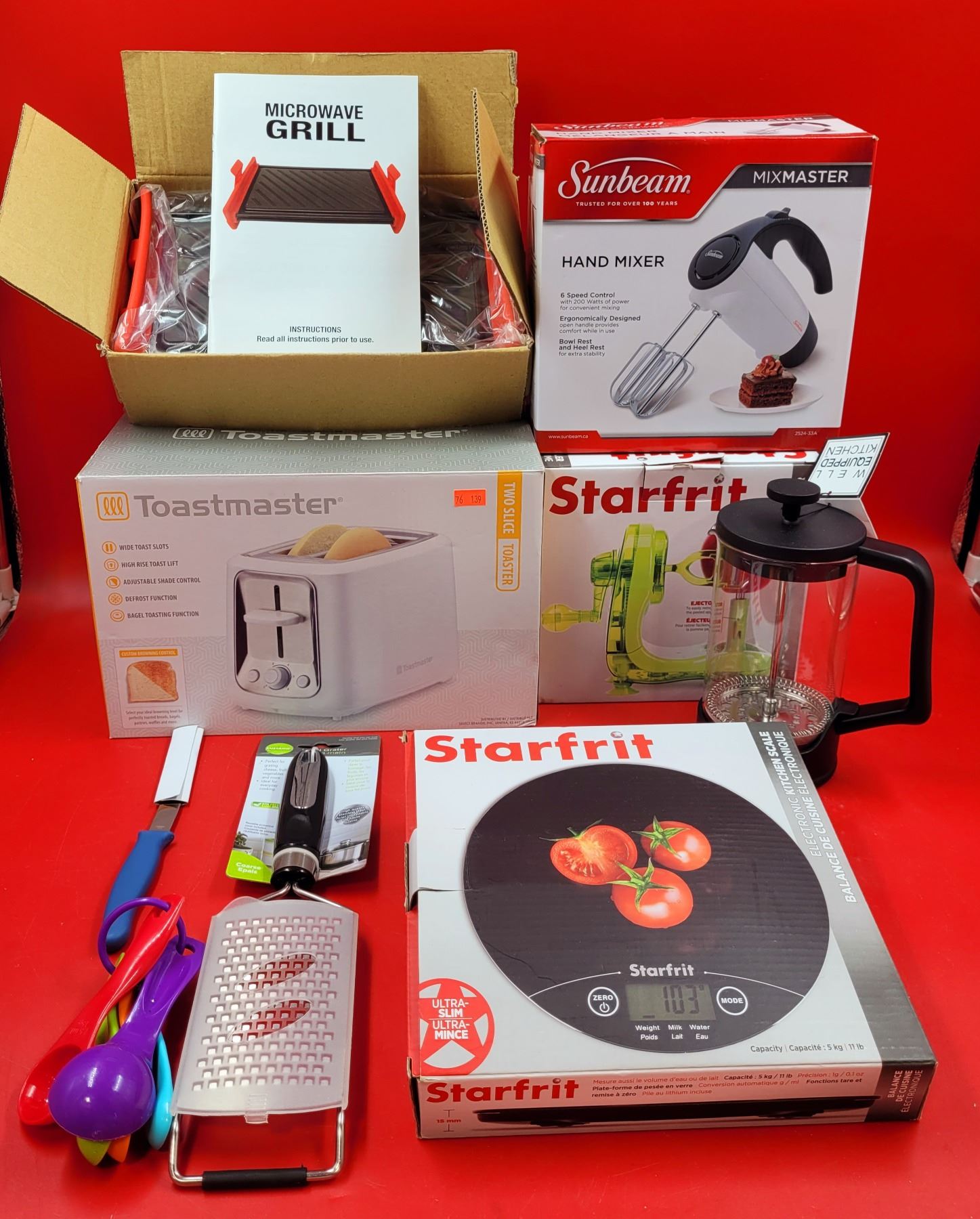 Assorted Kitchen Lot Including Sunbeam Hand Mixer, Toast Master Toaster & Starfrit Food Scale