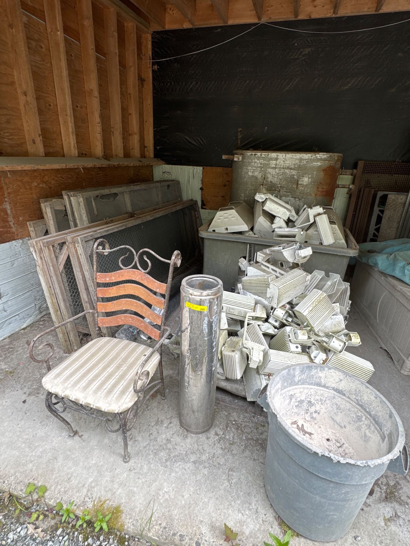Assorted Lot: Aluminum Lights, Oil Tank, Screens, Chair and Rolling Bin Cart